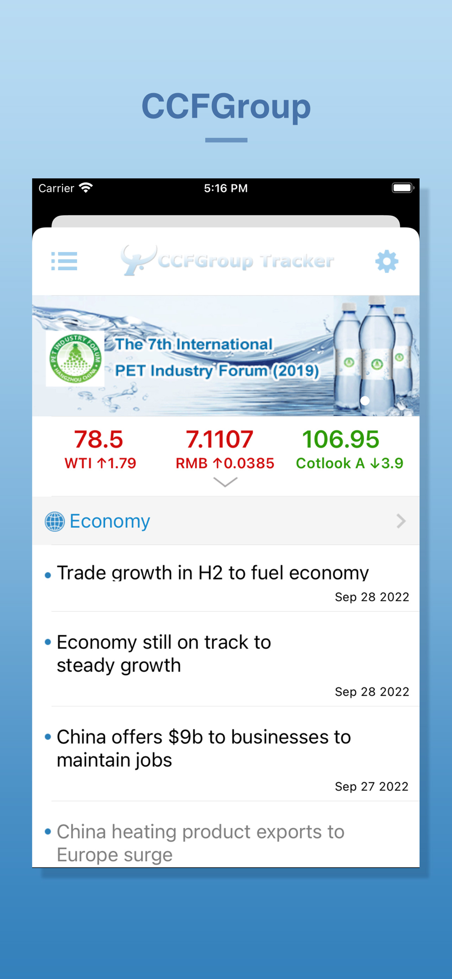 CCFGroup tracker is the app for iPhone users by Zhejiang Huarui Information Consulting (CCFGroup). It delivers breaking news, price movement and import/export data, etc. on China chemical fiber & textile industry including: