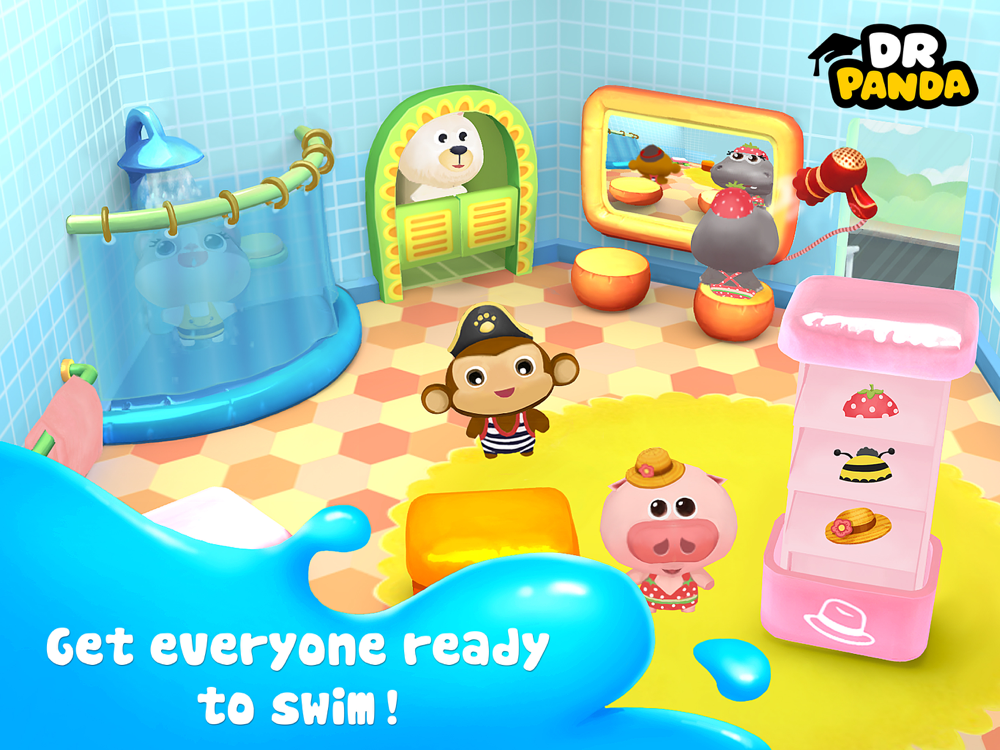Splash and play with five cute baby animals in Dr. Panda’s Swimming Pool! There are three big pools to dive into and five animals to take care of, so the fun never stops. Play dress up in the locker room, have a snack by the poolside, take a trip down a water slide or dive off the side off a pirate ship in search of hidden treasure!