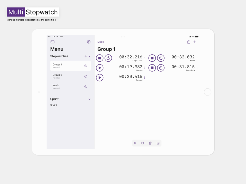 Multi-Stopwatch extends your normal stopwatch with many useful additional functions.