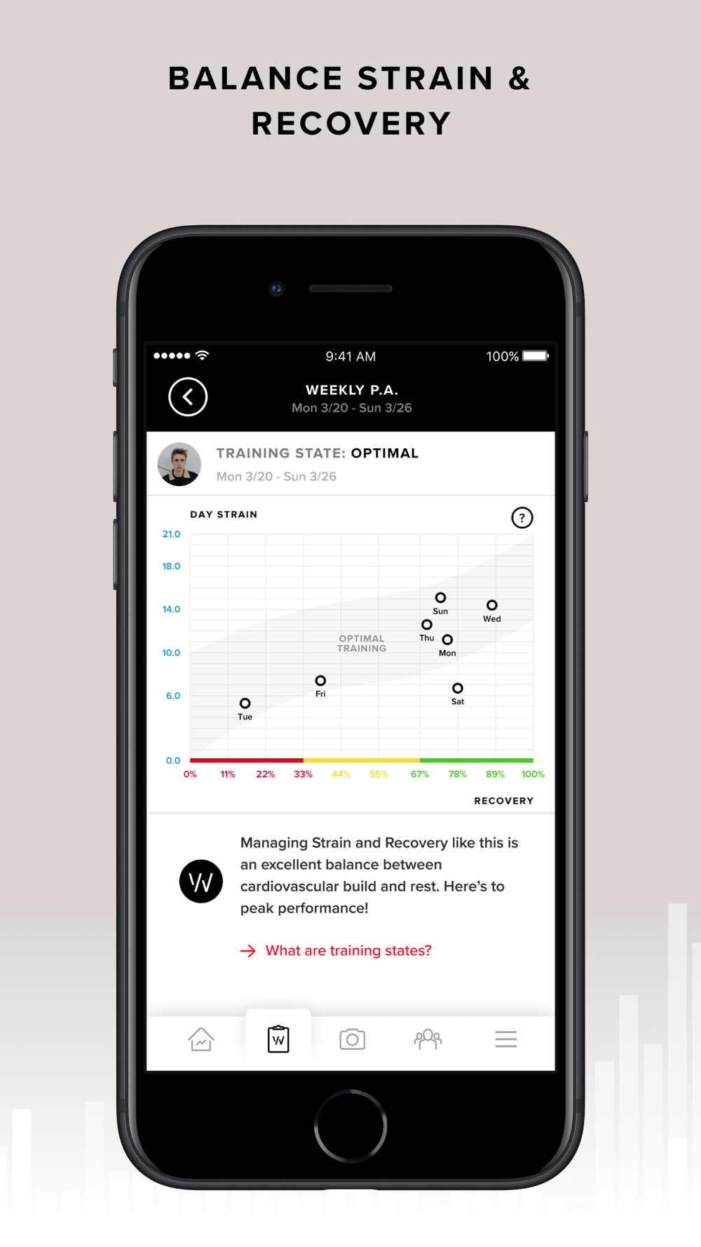 WHOOP optimizes performance for elite athletes through a continuous understanding of Strain and Recovery. When paired with a WHOOP Strap, the WHOOP App provides physiological data, analysis, and actionable insights that help athletes tailor their training, improve their sleep, and maximize their performance.