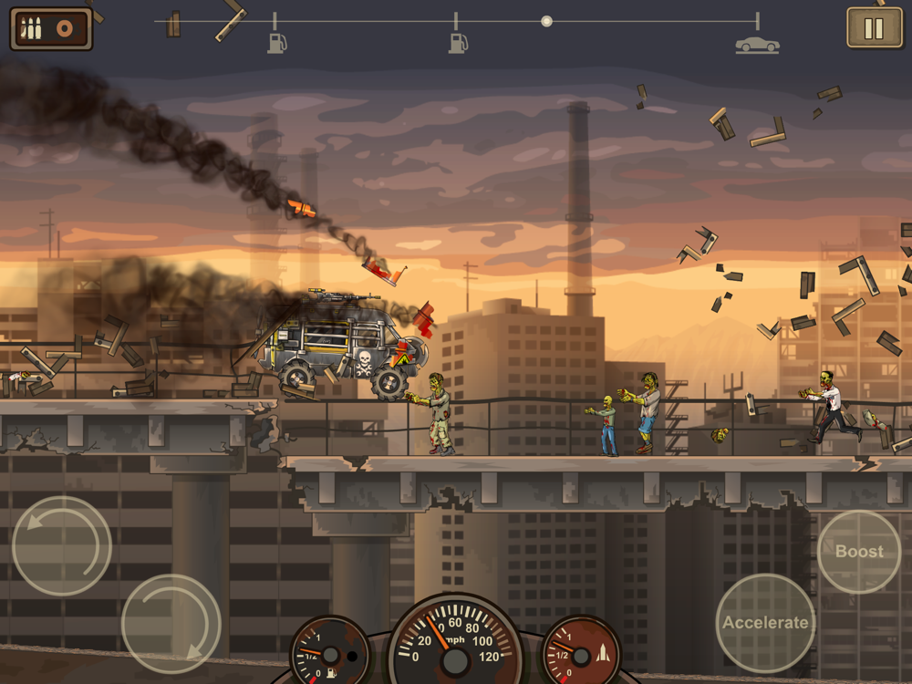 ● Multi-Tiered Levels: Drive across decayed highway overpasses, via underground tunnels or smash through epic zombie filled factories