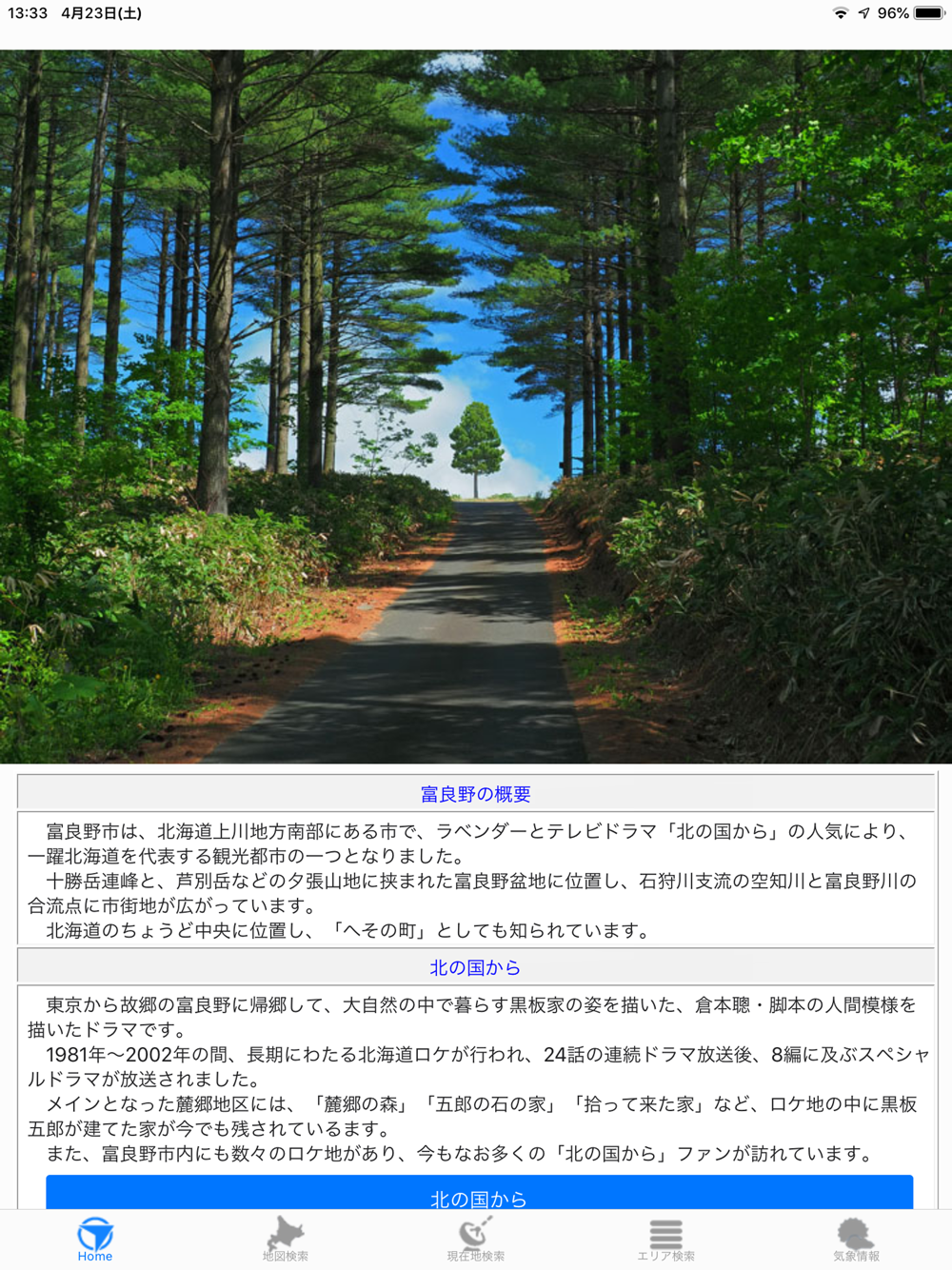 この『富良野ロケ地をめぐる旅』は、ドラマ「北の国から」「優しい時間」「風のガーデン」のロケ地や、「ファーム富田」をはじめとする富良野周辺のビューポイントを地図や写真とともに紹介するアプリで、観光ガイド等に記載されていないようなロケ地やビューポイントも多数紹介しております。