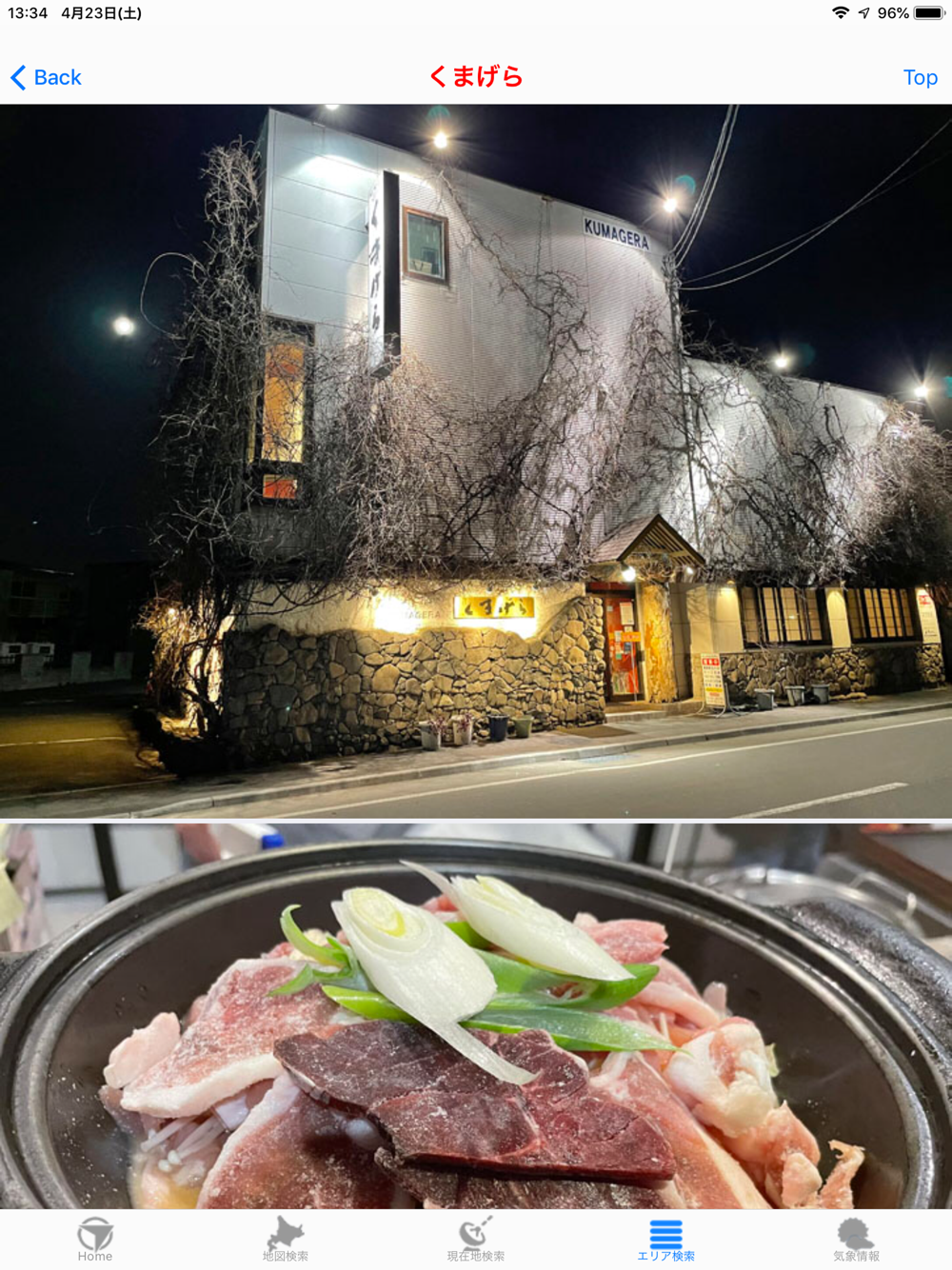 写真とともに住所、マップコード、簡単なコメントを表示します。ボタンが「ビューポイントMAP」と表示されている場合、そこをタップすると表示されている写真を実際に撮影した場所が航空写真で表示されます。ボタンが「被写体名称 MAP(例:「五郎の石の家MAP」等)」と表示されている場合、そこをタップすると被写体の場所が航空写真で表示されます。また、「現在地からのルートMAP」をタップすると、地図上にルートが表示されるととともに、地図上のアイコンをタップすると、「現在地からの直線距離」と「ルート上の移動距離」が吹き出し表示されます。また、「NaviConへ送る」をタップすると、株式会社デンソーのアプリNaviConを利用してカーナビに地点を送信できます。