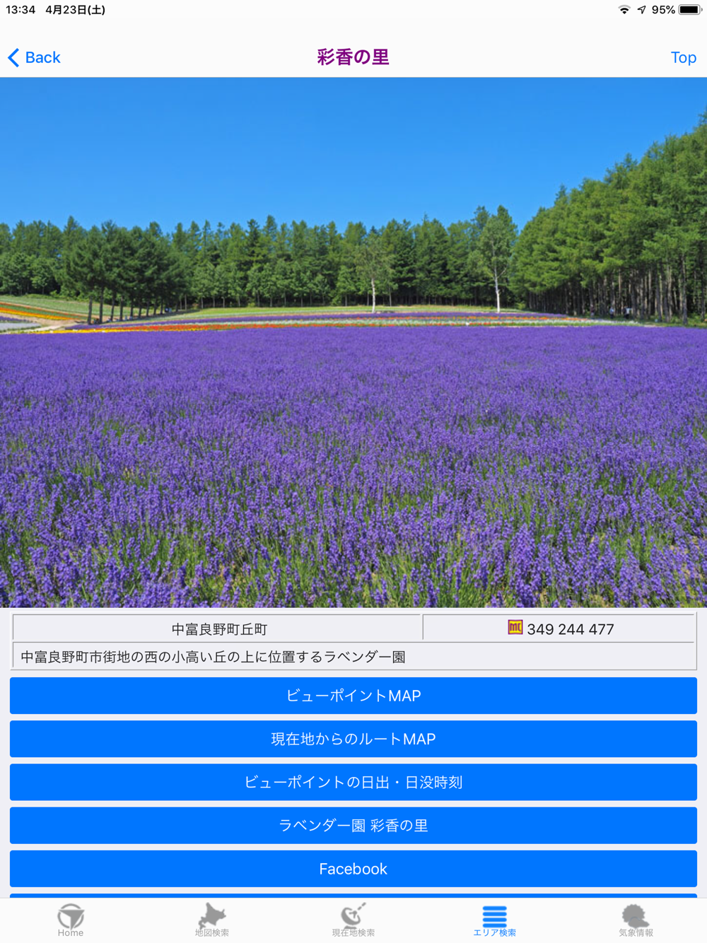 「麓郷・八幡丘」「富良野市街地」「北の峰・御料」「布部・山部」「中富良野方面」の5つのエリア毎にビューポイント名を一覧表示します。ビューポイント名をタップすると、ビューポイント情報が表示されます。