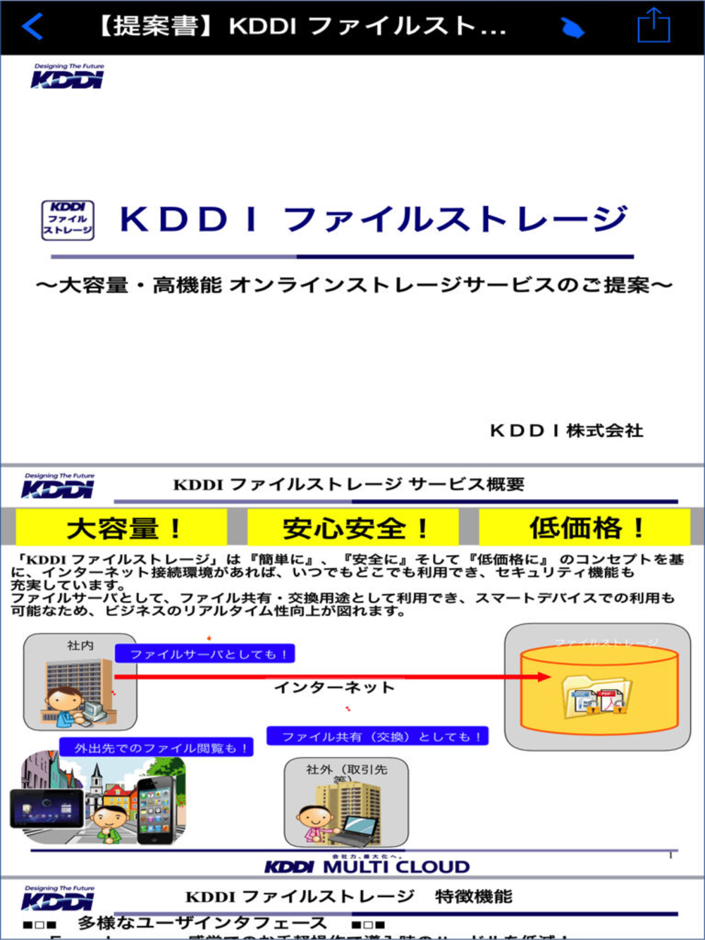 ・商品カタログや提案資料などを「KDDI ファイルストレージ」に保管しておくだけで外回り営業のツールとして大変有益です。