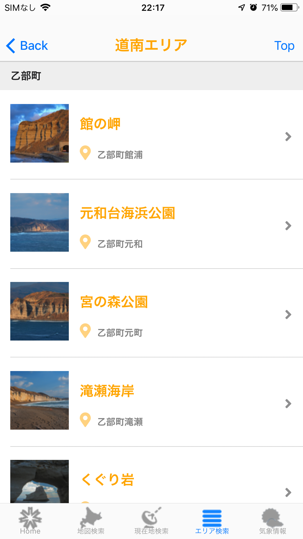 「道央エリア」「道南エリア」「道北エリア」「十勝エリア」「オホーツクエリア」「釧路・根室エリア」の6つのエリア毎にビューポイント名を一覧表示します。ビューポイント名をタップすると、ビューポイント情報が表示されます。