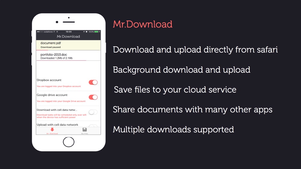 Mr.Download it's perfectly integrated with iOS, download from your browser and access your files from everywhere.
