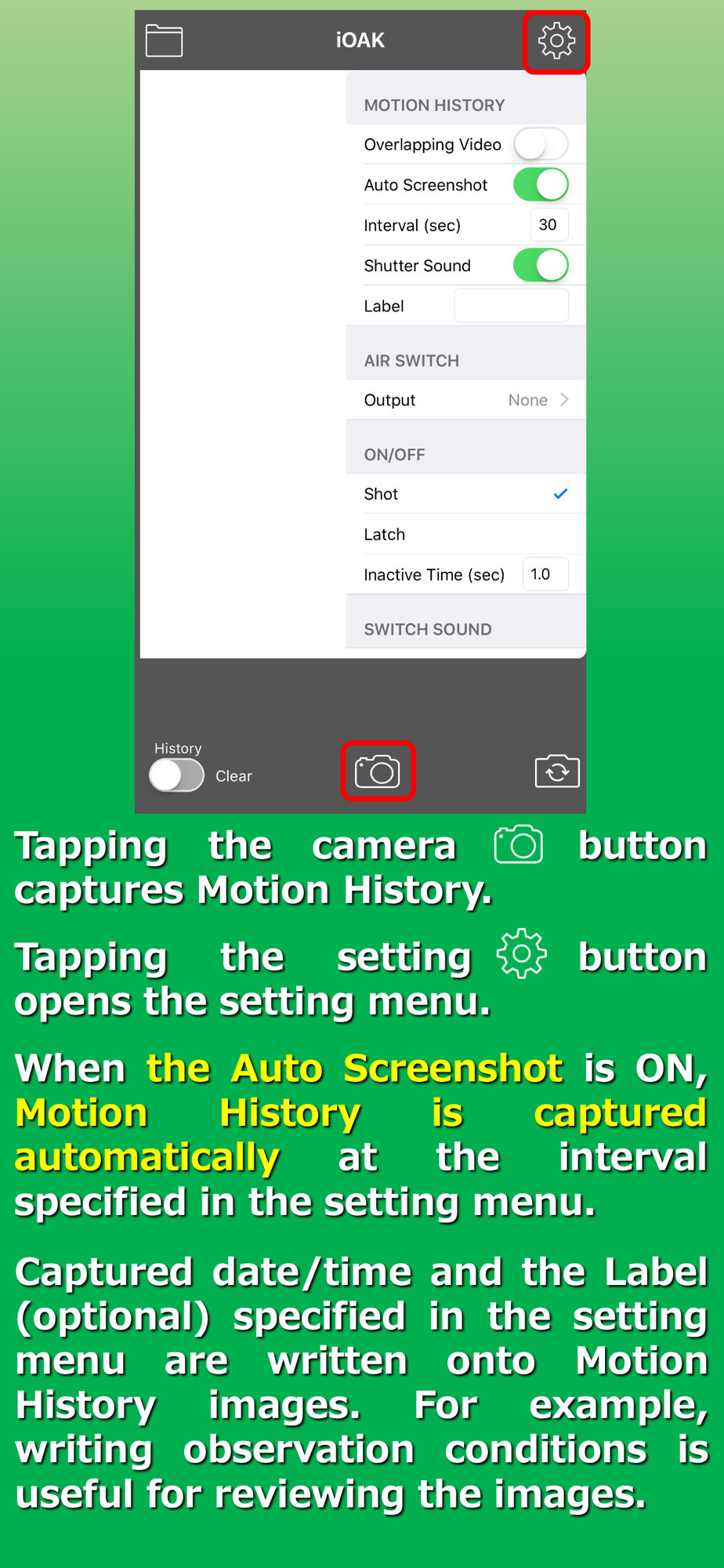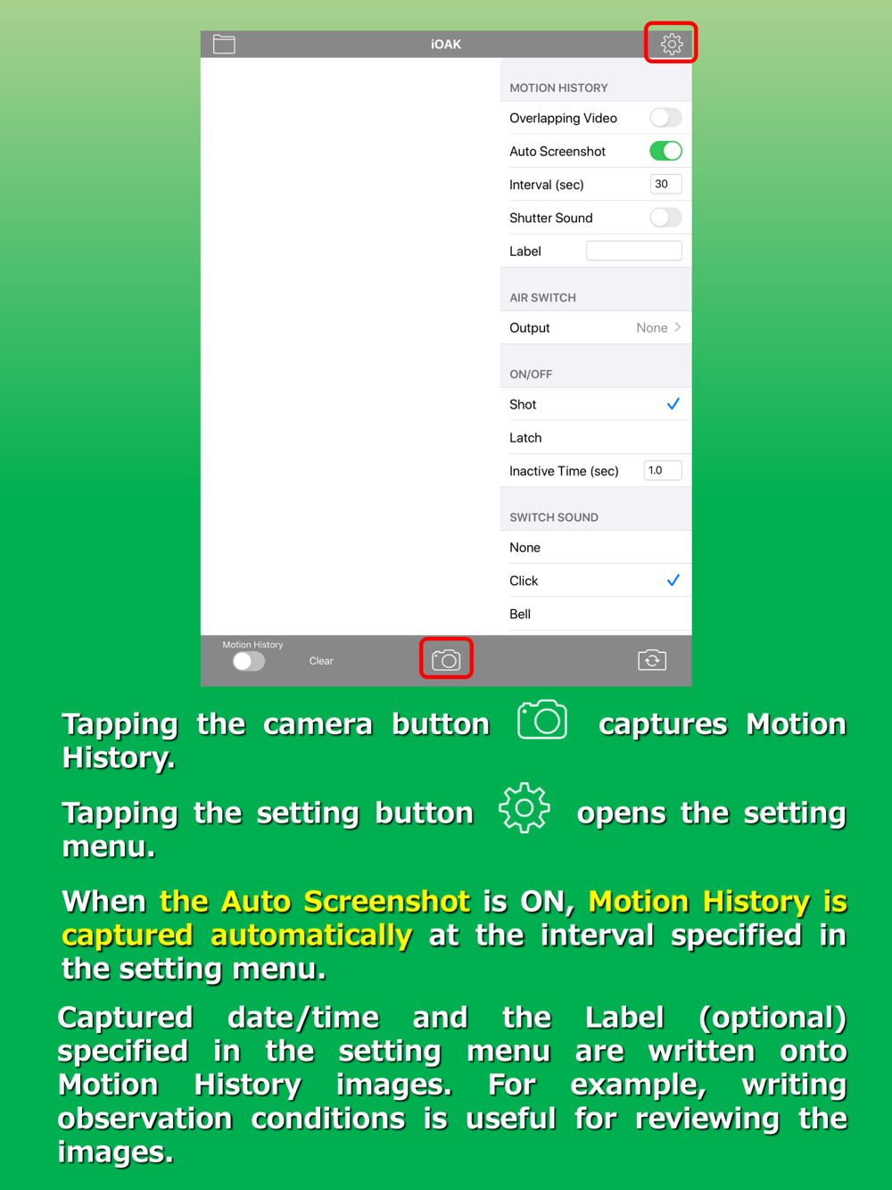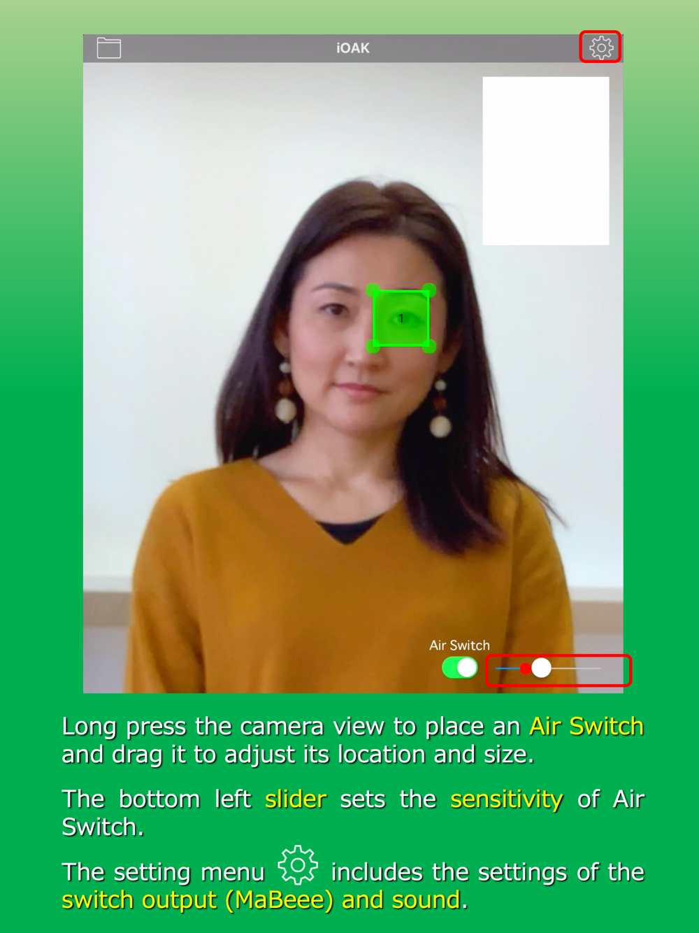 Draw rectangles on the camera screen as non-contact switches which can be activated by the movement within the areas. Air Switches can control battery type wireless switch, MaBeee.