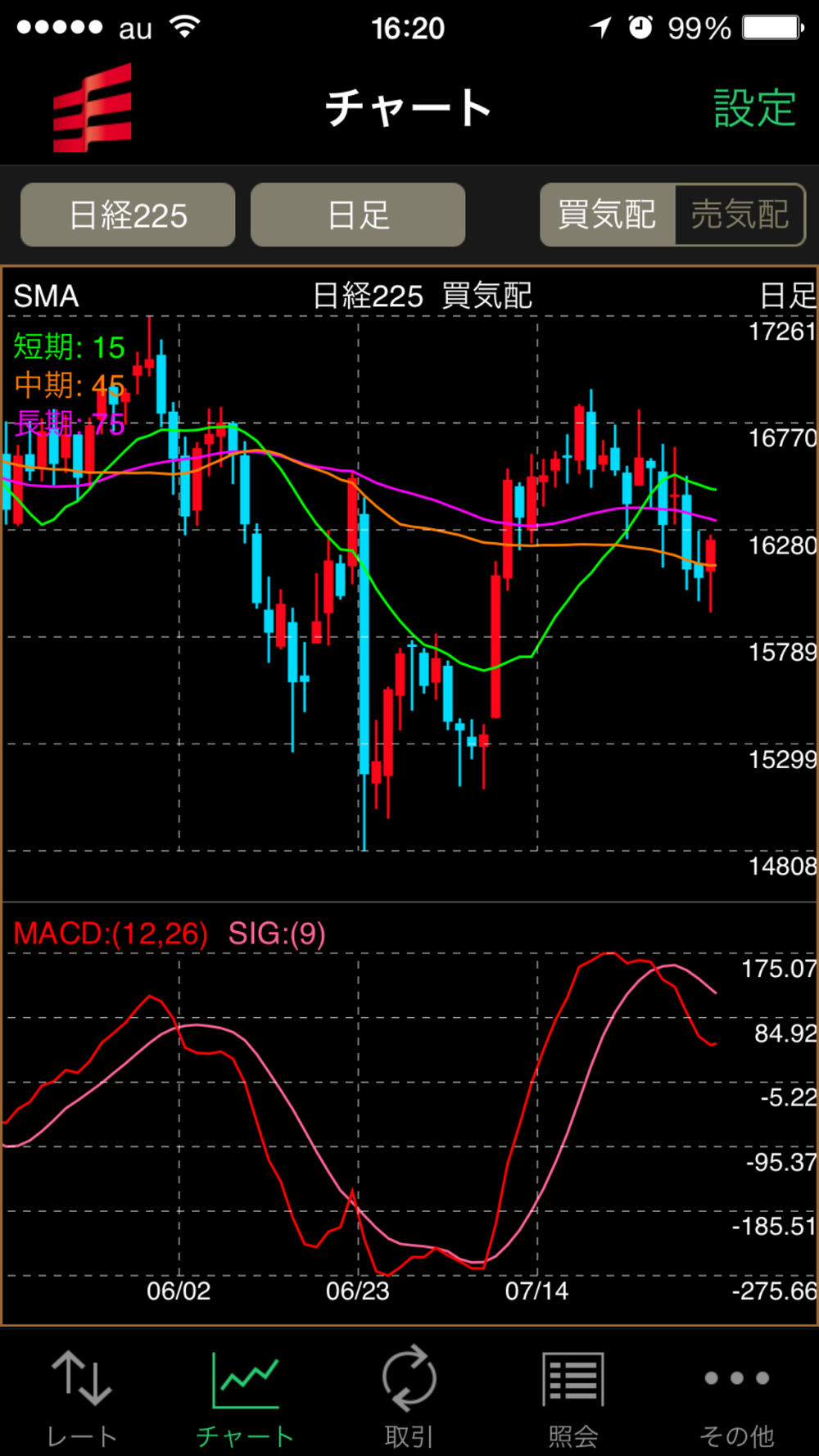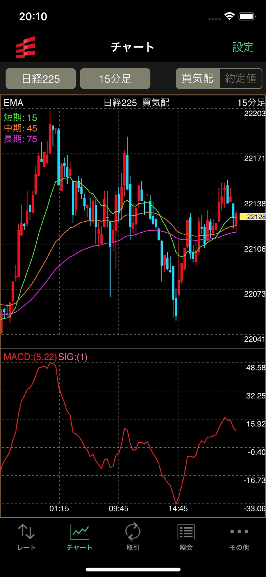 リアルタイムのチャート描画にくわえ、25種類の豊富なテクニカル指標や自動トレンドライン表示によりチャート分析を強力にサポートします。