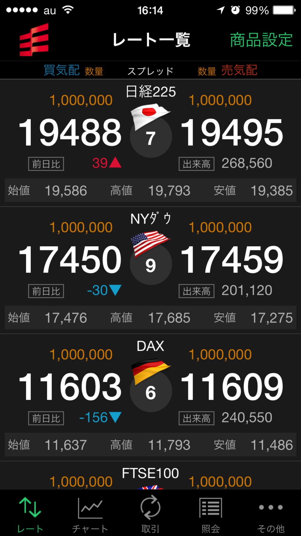 くりっく株365取り扱い株価指数(日経225・NYダウ・NASDAQ-100・DAX・FTSE100・金ETF・原油ETF)のリアルタイムレートを配信。