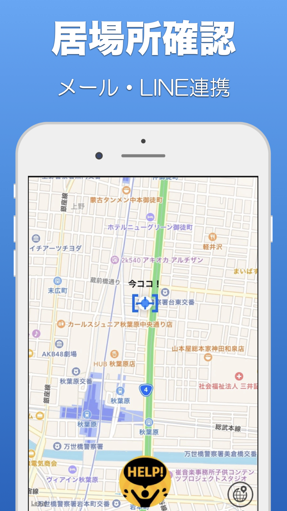また、緊急時にSNS等で自分の現在地を連絡出来る機能「今ココ!」があります。