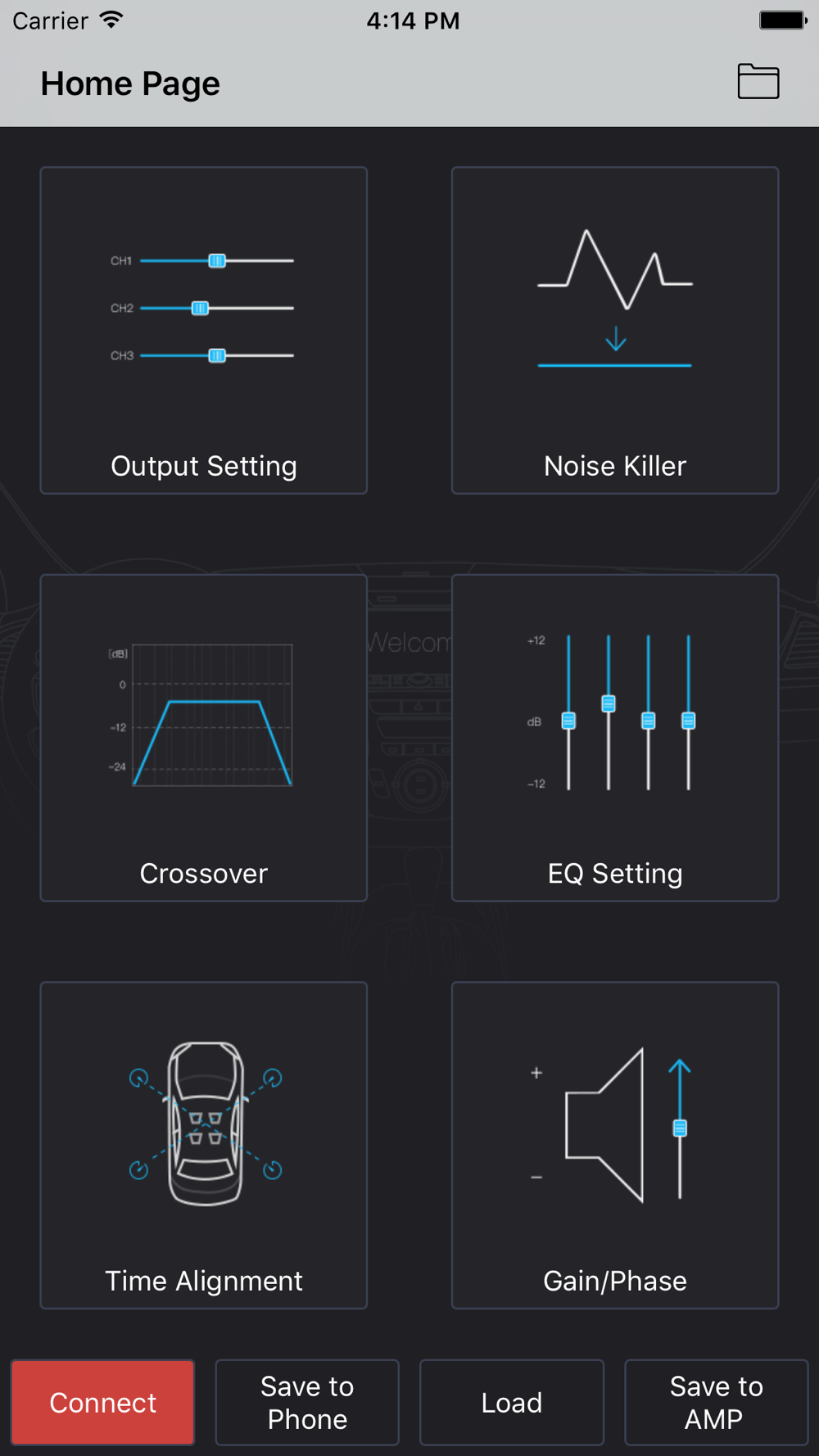 After connecting App to Car Amplifier with Integrated DSP,  EQ, BASS, TIME ALIGNMENT, PHASE, MUTE, FILTER , SAVE SOUND SETTING TO PHONE, SAVE SOUND SETTING TO AMPLIFIER, LOAD SOUND SETTING FROM PHONE, RCA OUTPUT etc could be controlled through this App.