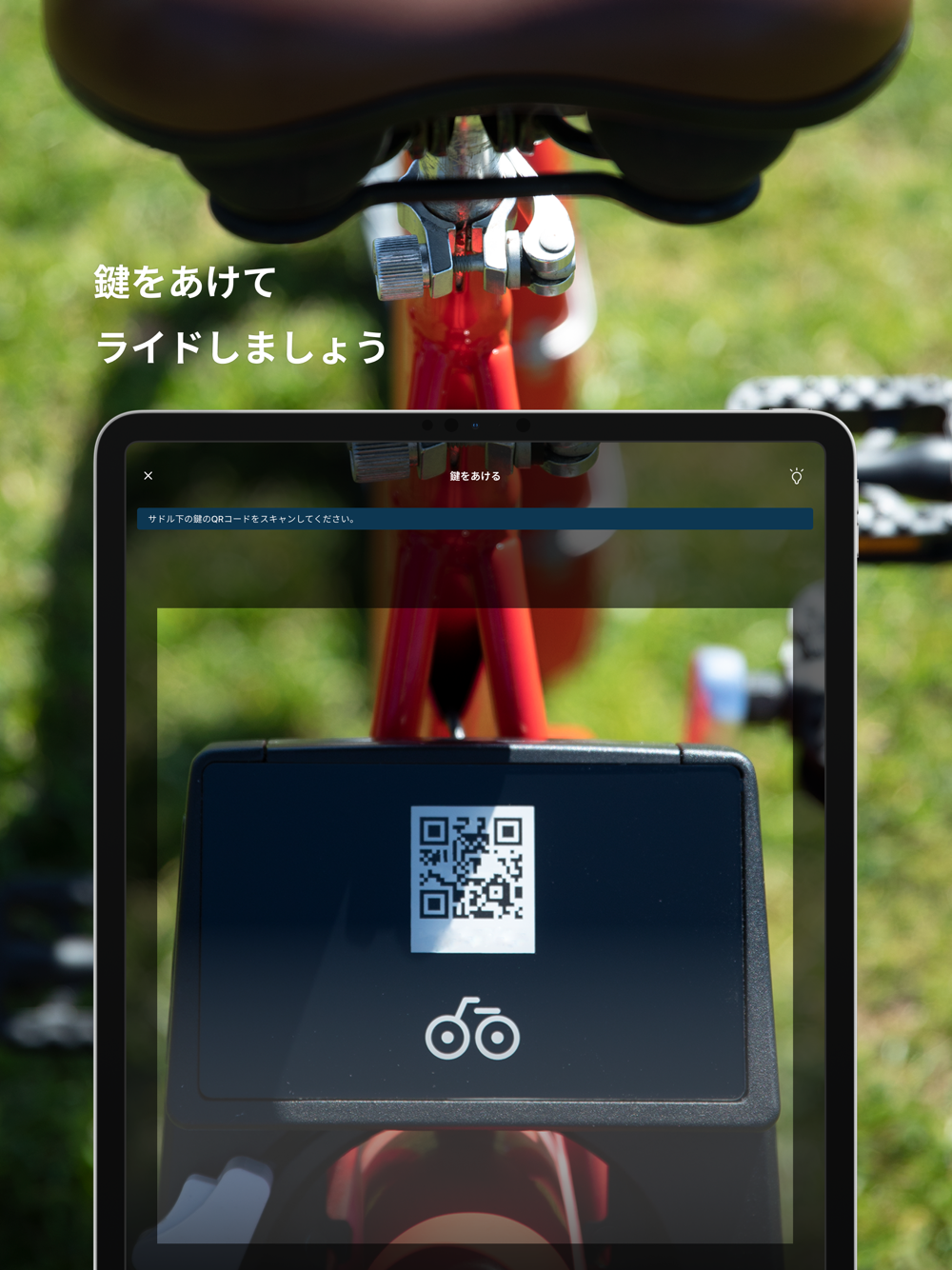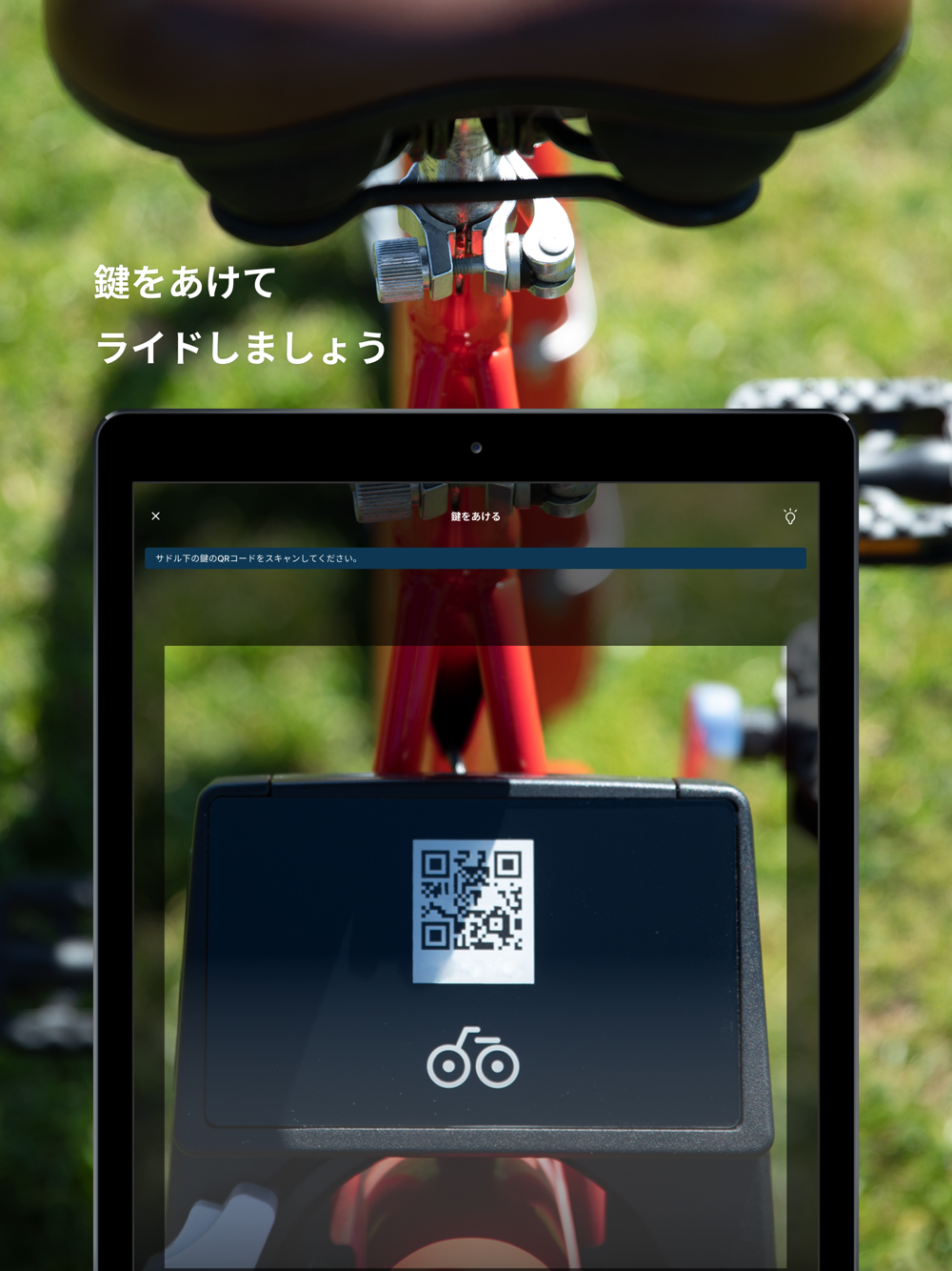 街なかで赤い専用の自転車をみつけたら、スマートフォンを使って鍵をあけます。