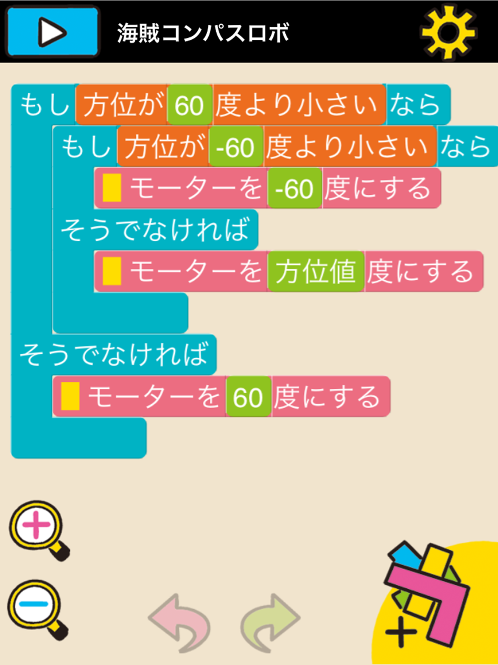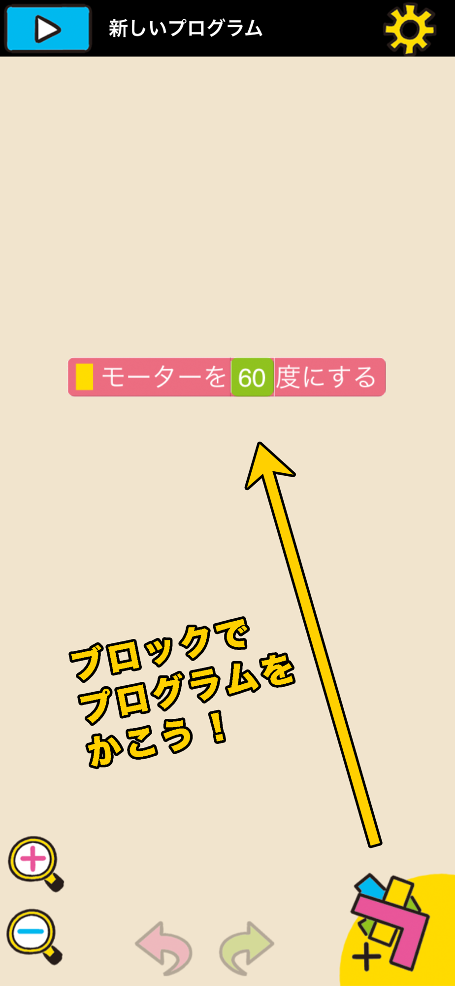 プログラミングは、用意されたブロックを組み合わせるだけ。だれでも簡単に、iPhoneに搭載されたセンサーを使ったプログラミングを体験することができます。(サーボモータを接続しなくても、画面上のプレビュー画面で、プログラミング結果のサーボモーターの動作が確認できます。)