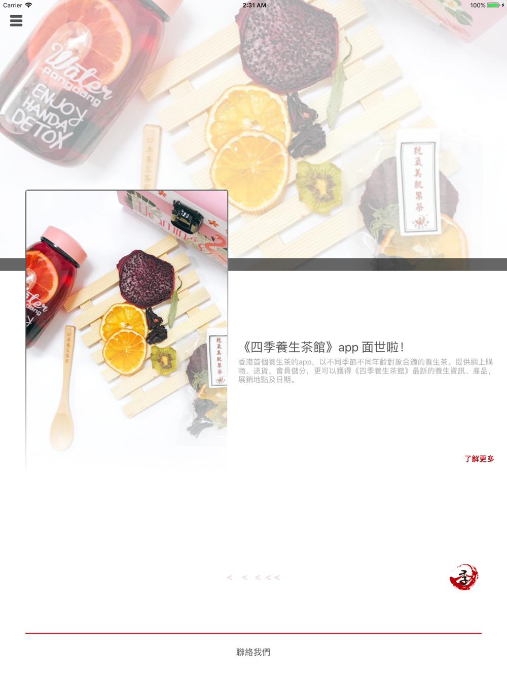香港首個養生茶的app,以不同季節不同年齡對象合適的養生茶。提供網上購物、送貨、會員儲分,更可以獲得《四季養生茶館》最新的養生資訊、產品,展銷地點及日期。