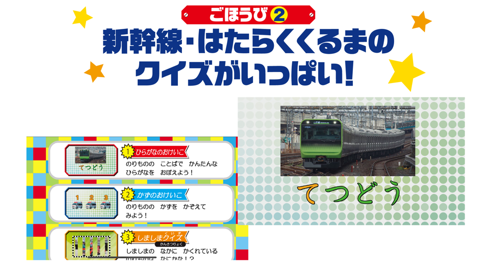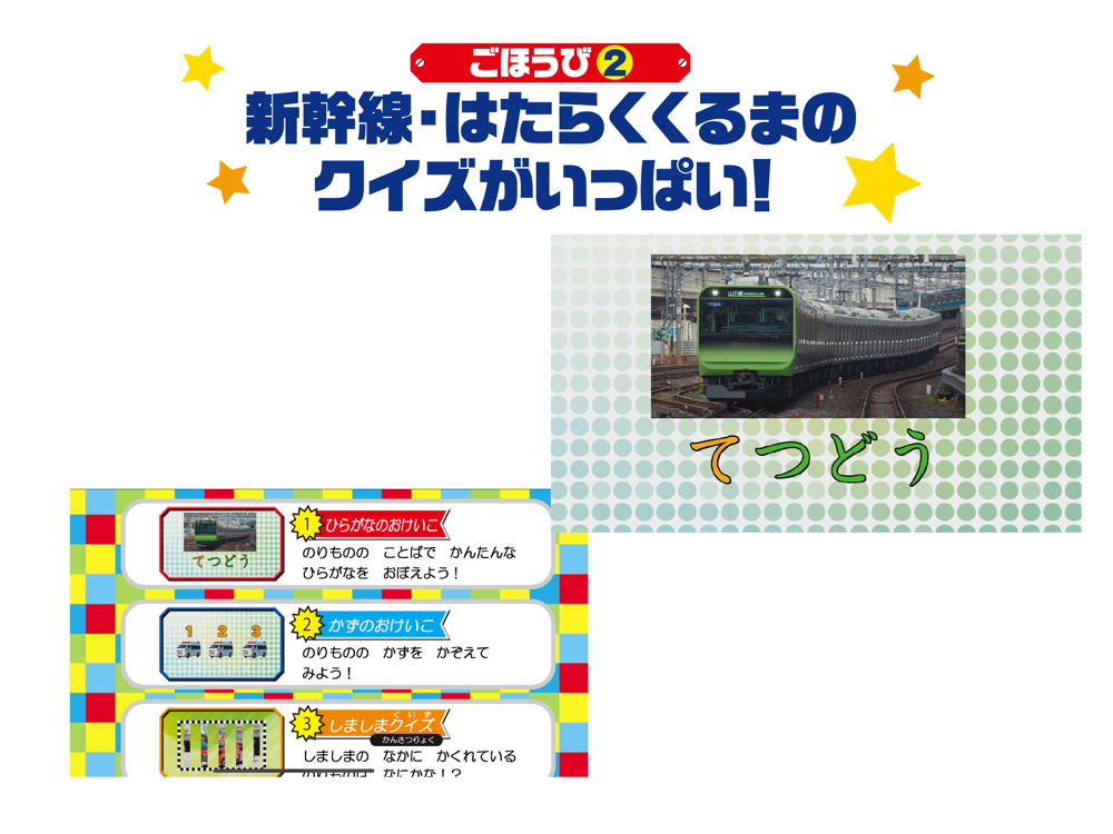 新幹線や特急、はたらくくるまなど、大好きなのりものと一緒におけいこできます。