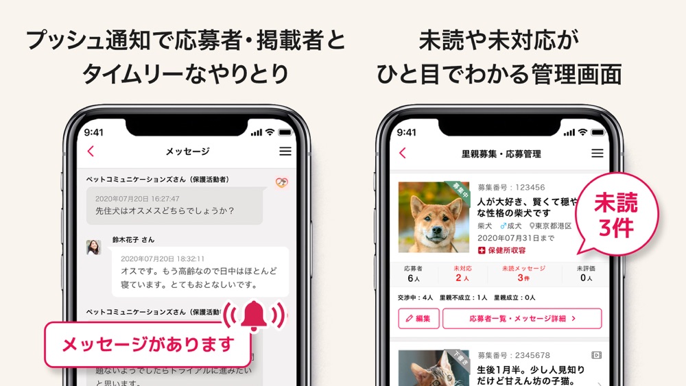 希望条件に合うペットの掲載を即時通知する為、アプリメンバーシップに登録済みの里親希望者はいち早く希望の里親募集に応募できる他、プッシュ通知でタイムリーかつズムーズなやりとりが可能です。