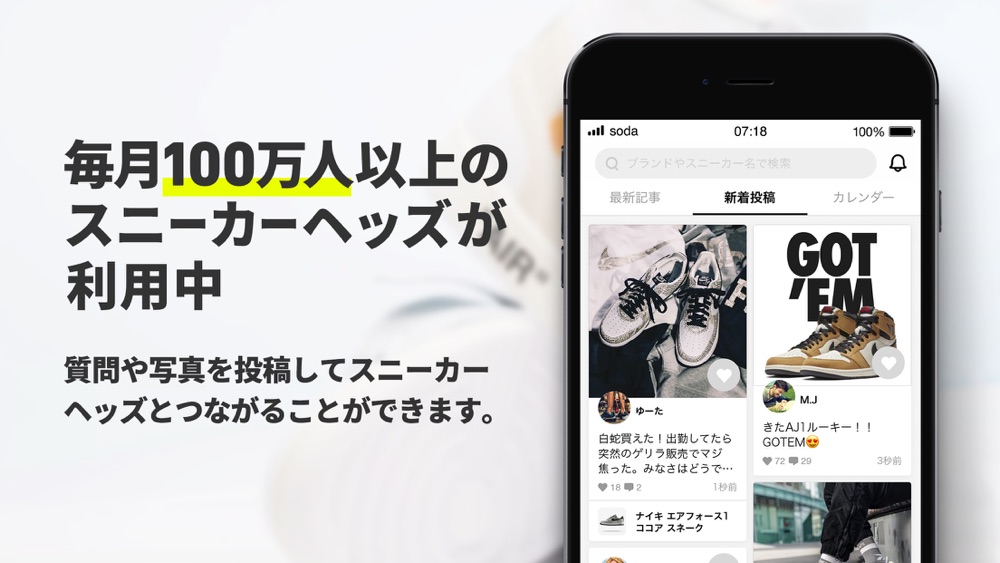 自慢のスニーカー写真を投稿したり、スニーカーに合うコーデを質問したり、スニーカー好き・お洒落さんとつながることができます。
