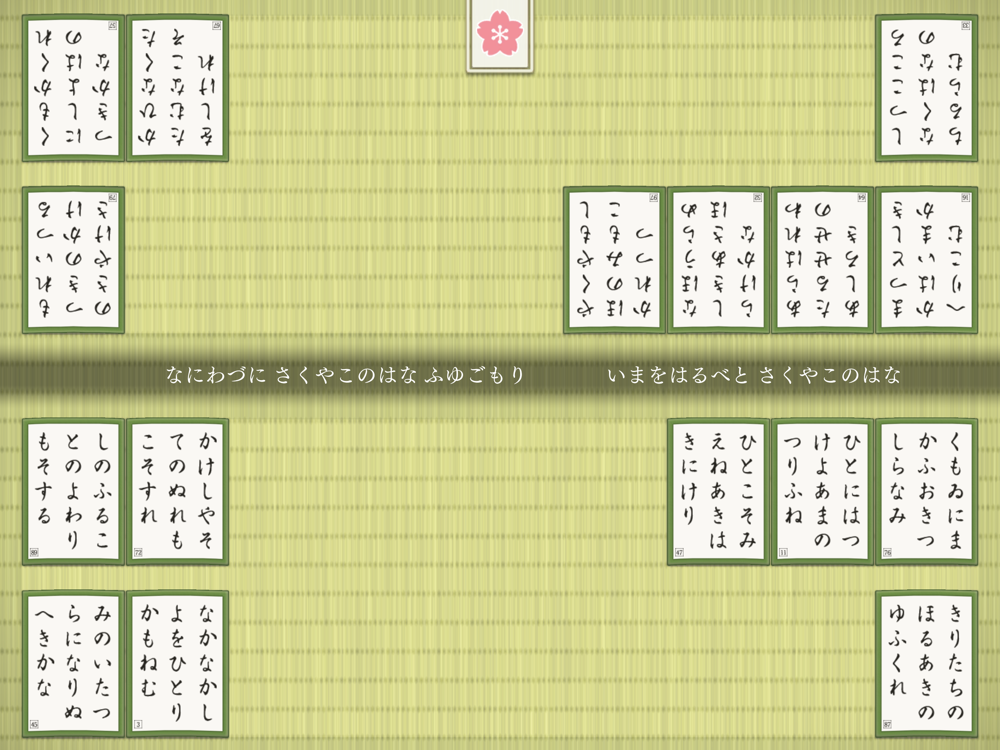 暗記時間、から札、お手つき、送り札、札押しなど競技かるたの公式ルールを再現しました。