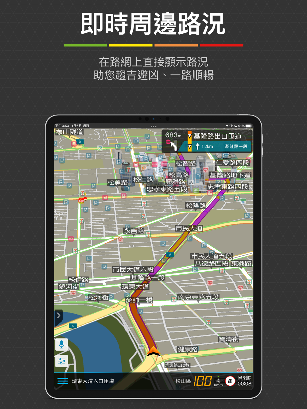 ● 國際車廠等級,全新雲端路況運算版本,永遠提供您即時路況,避開塞車路段。