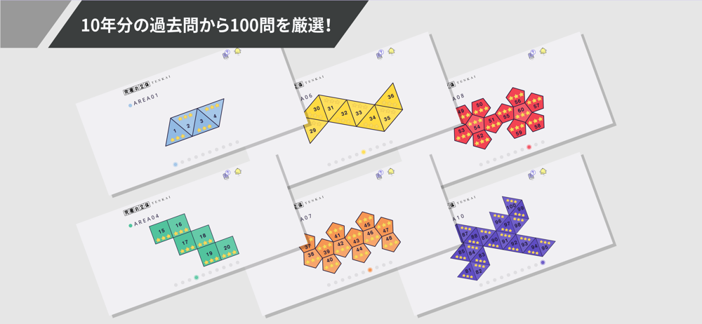中学入試算数の頻出分野「展開図」の問題を100題収録し、展開図が組み上がるアニメーションや、わかりやすい解説イラストを通して学ぶ教材アプリです。