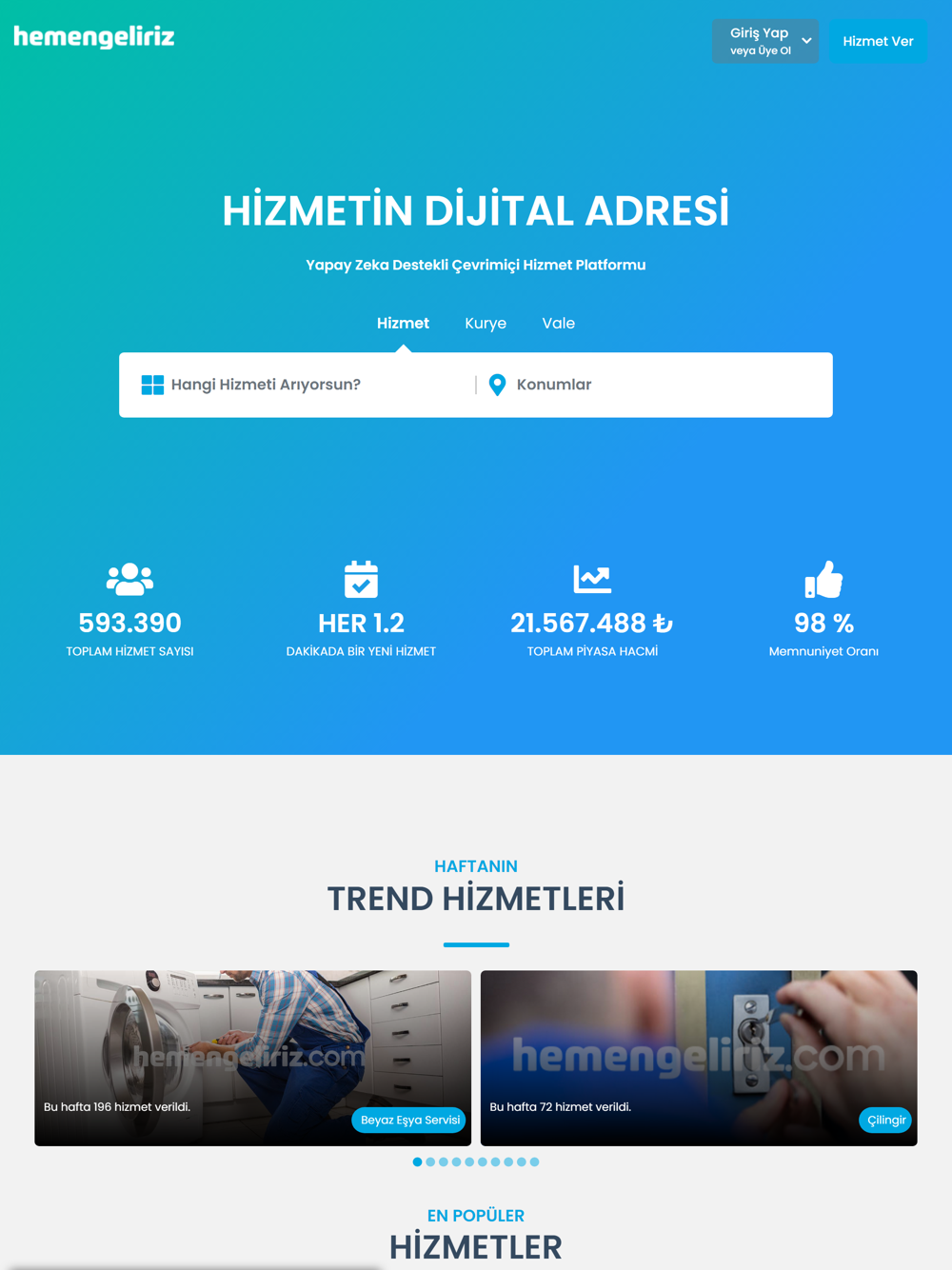 Hemengeliriz, yapay zeka destekli çevrimiçi bir pazar yeri uygulamasıdır. Yüzlerce meslekten en iyi firmalar ile telefon görüşmesi yaparsınız. Yapay zeka yapılan telefon görüşmesini dinler ve görüşmenin içeriği anlar. Telefon görüşmesi başlattığınız firmadan bir hizmet alacaksanız, yapay zeka süreci sona ana kadar takip ve analiz ederek, hızlı, kaliteli, hesaplı ve grantili bir hizmet almanızı sağlar. Sorun anında sürece müdahil olur ve mutlu kullanıcılar biriktirir.