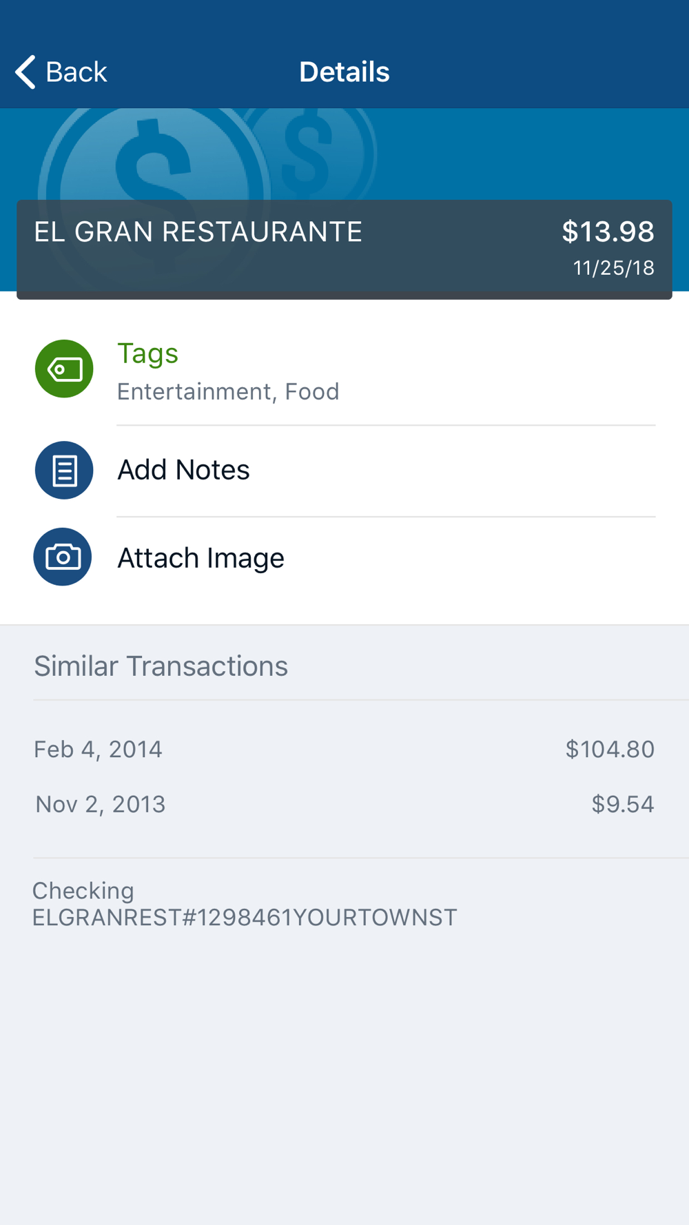 - Keep your transactions organized by allowing you to add tags, notes and photos of receipts and checks.