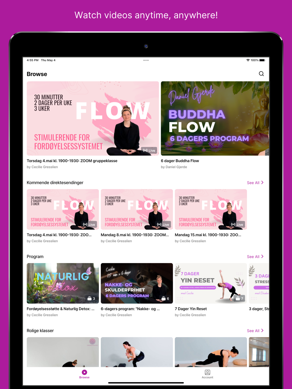 - Utforske et stort utvalg av treningsvideoer for alle nivåer