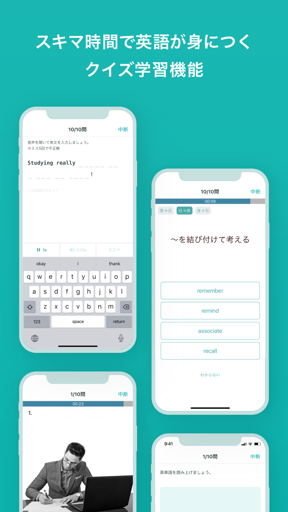 書籍の内容を基に作成されたクイズを解いて力試しができます。ゲームのように楽しみながら、スマホで手軽にアウトプット学習ができます。単語やTOEIC(R)、音読など、幅広い問題形式に対応。