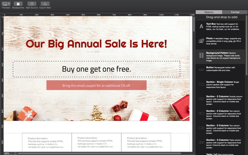 Once your design is complete, you can export to responsive HTML source code format, ready for use with your newsletter distribution tool (please use one that supports responsive HTML).