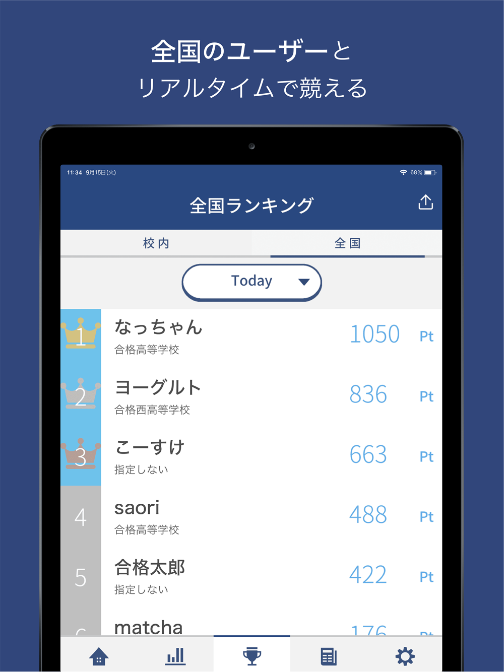 正解単語数で全国・校内のユーザーと競争できます。上位入賞で自分の名前を他のユーザーに知らしめましょう!