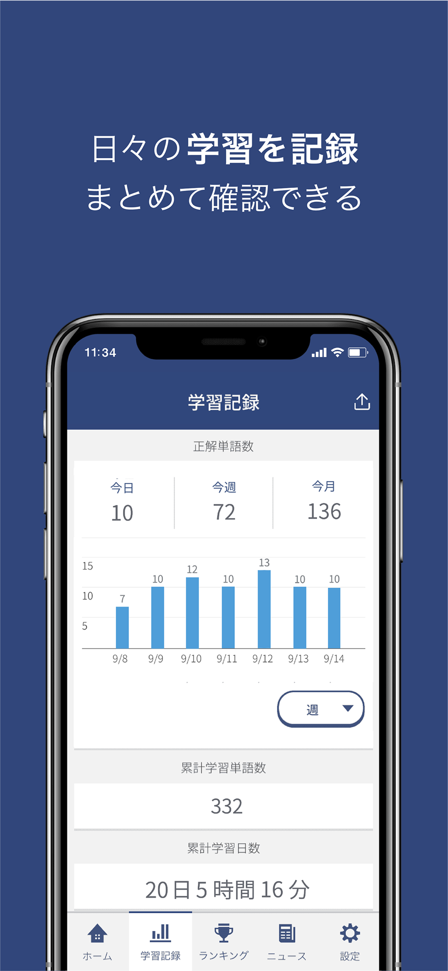 その日正解した単語数や学習時間など、あとあときっと自信につながる学習の記録を自動で行います!