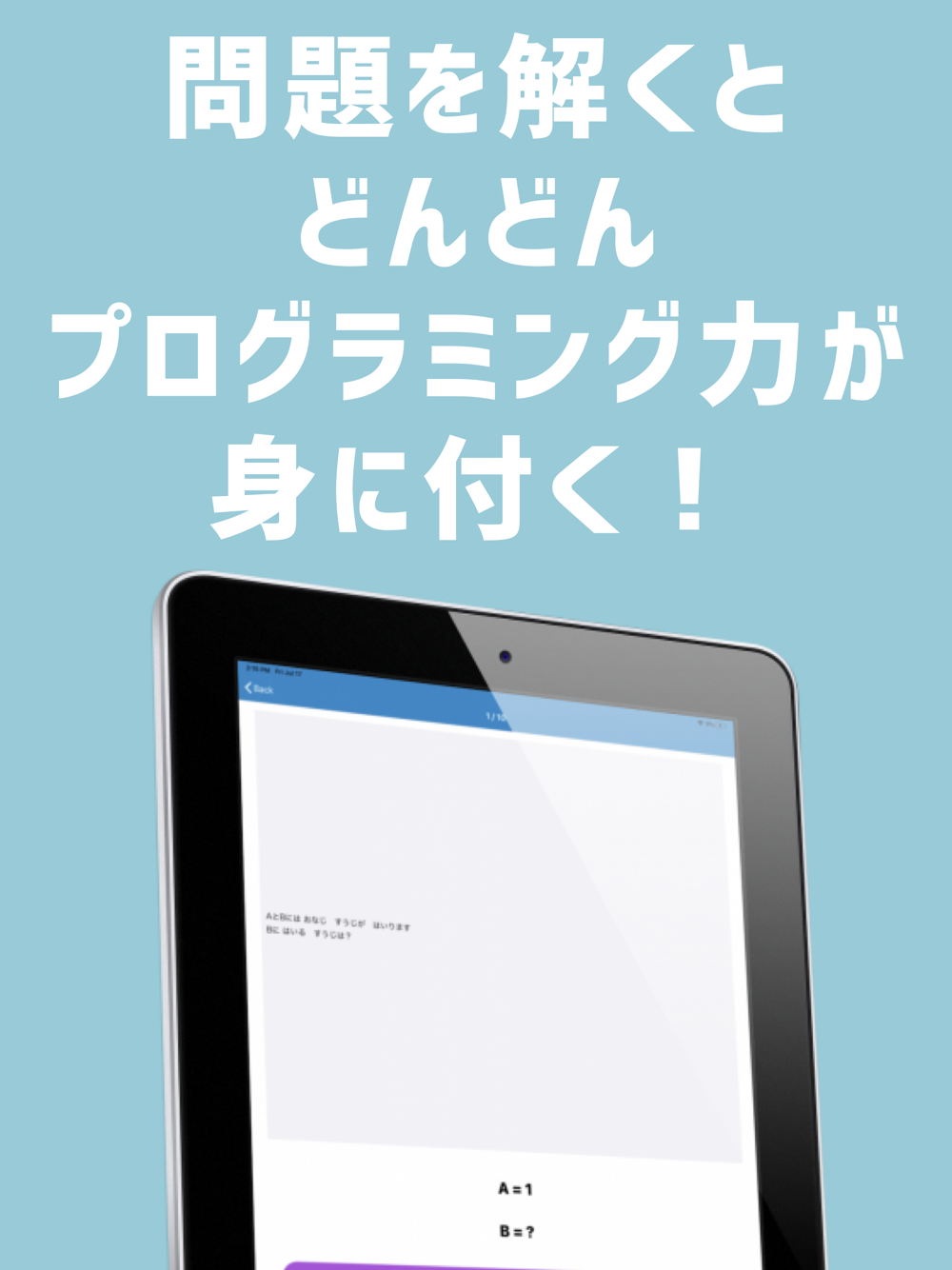 簡単な計算式を解いたり数を数えたり、ドリル形式で学習を進めることでプログラミングの基本的な考え方が身に付く子供向けのプログラミング学習アプリです。