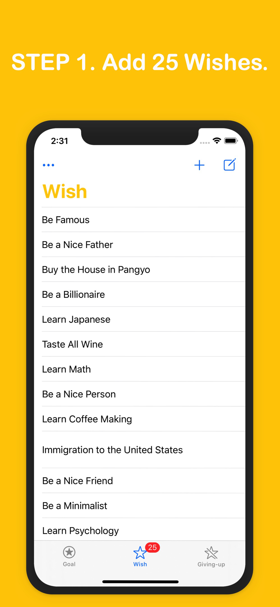 First, Write 25 wishes you want to accomplish in your lifetime.