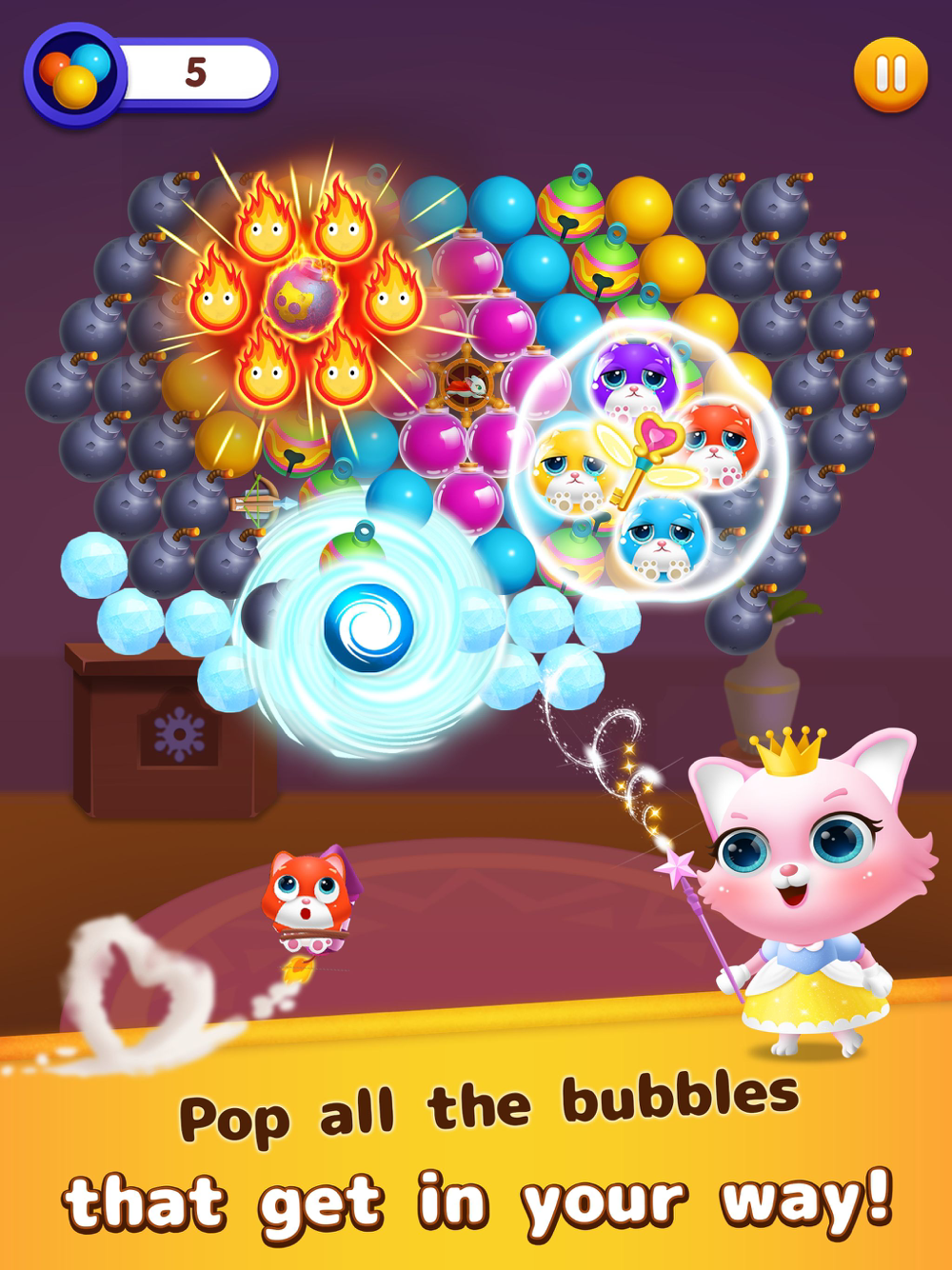- Clear all the bubbles on the screen or complete mission of each level before you run out of move to rescue Anna's kittens and Queen Sophia to level up and get 3 stars.