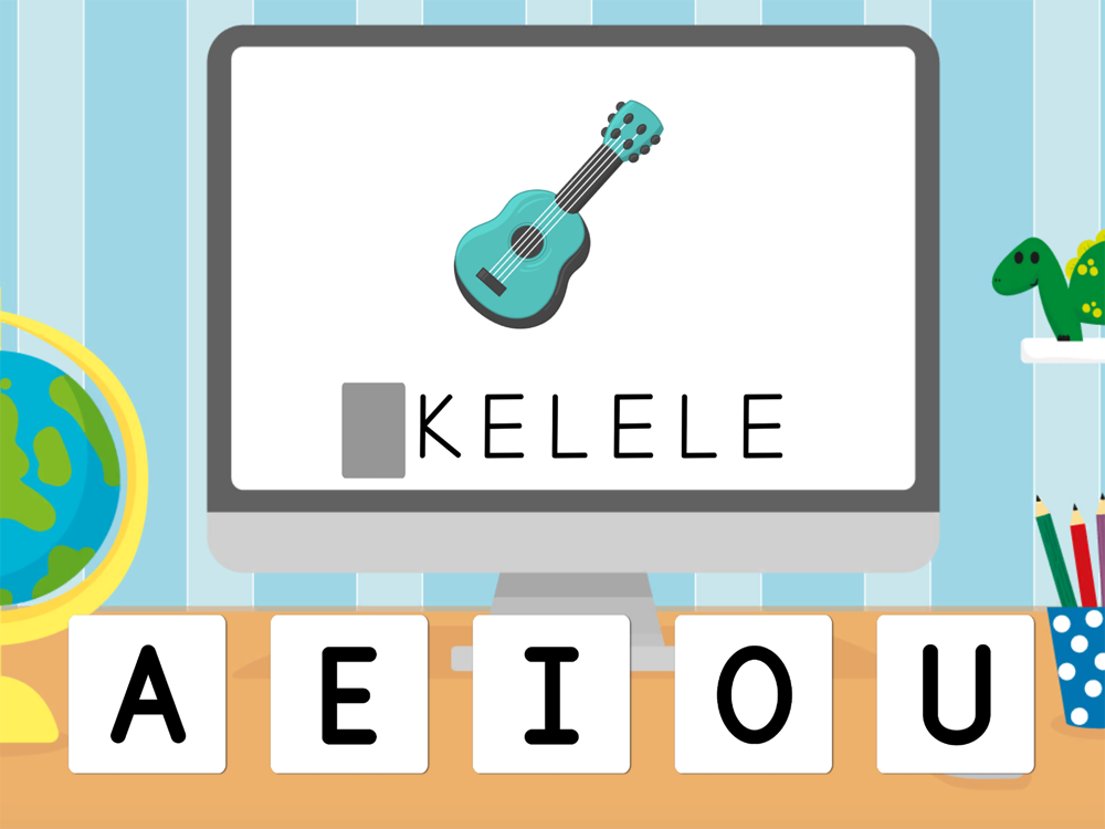 - ¿Qué letra falta? se muestra la imagen y una palabra a la que le falta la primera letra, los niños deben pulsar la vocal correcta para completar la palabra.