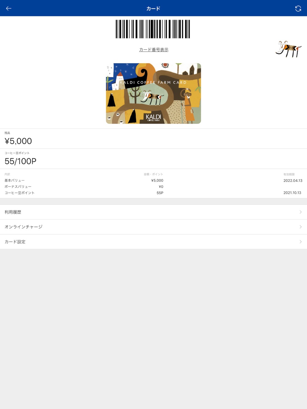 カルディカードのアプリカードとして、カルディコーヒーファームでのお買い物の際キャッシュレスでお支払いができ、オリジナルコーヒー豆をお買い上げでコーヒー豆ポイントが貯まる便利なアプリです。