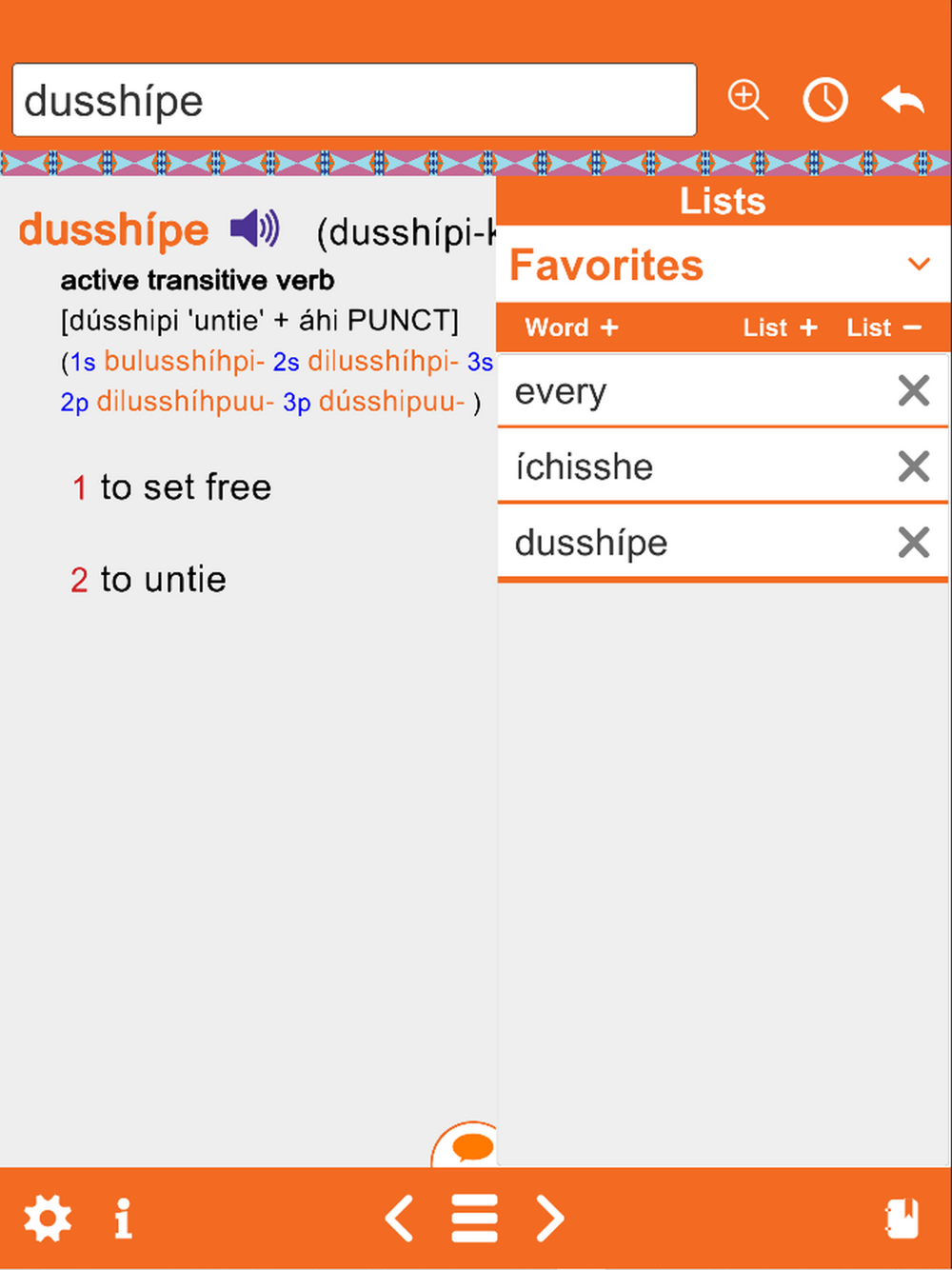 • The Favorites panel allows you to save your favorite words like a bookmark. From this panel, you can create new lists, add words to specific lists for later review, and better organize using the Crow Mobile Dictionary as YOUR Crow language learning tool