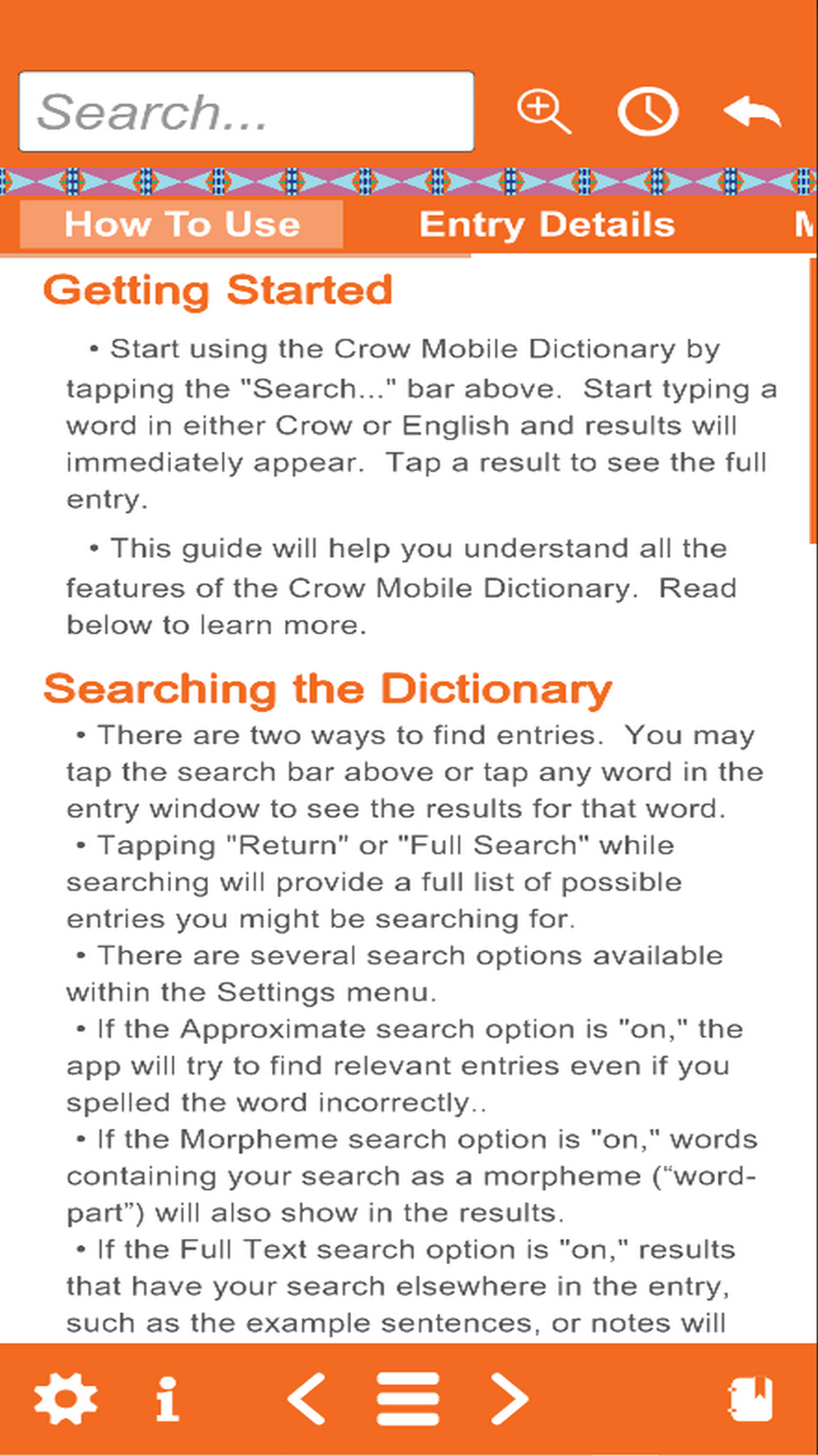 • There are two sides to the Crow Mobile Dictionary. If you are currently viewing a Crow word, you are on the “Crow” side. The left and right buttons will take you to the next or previous Crow word in alphabetical order. Tapping the Hamburger button will provide you with a list of the nearest alphabetical words to the entry you are currently looking at