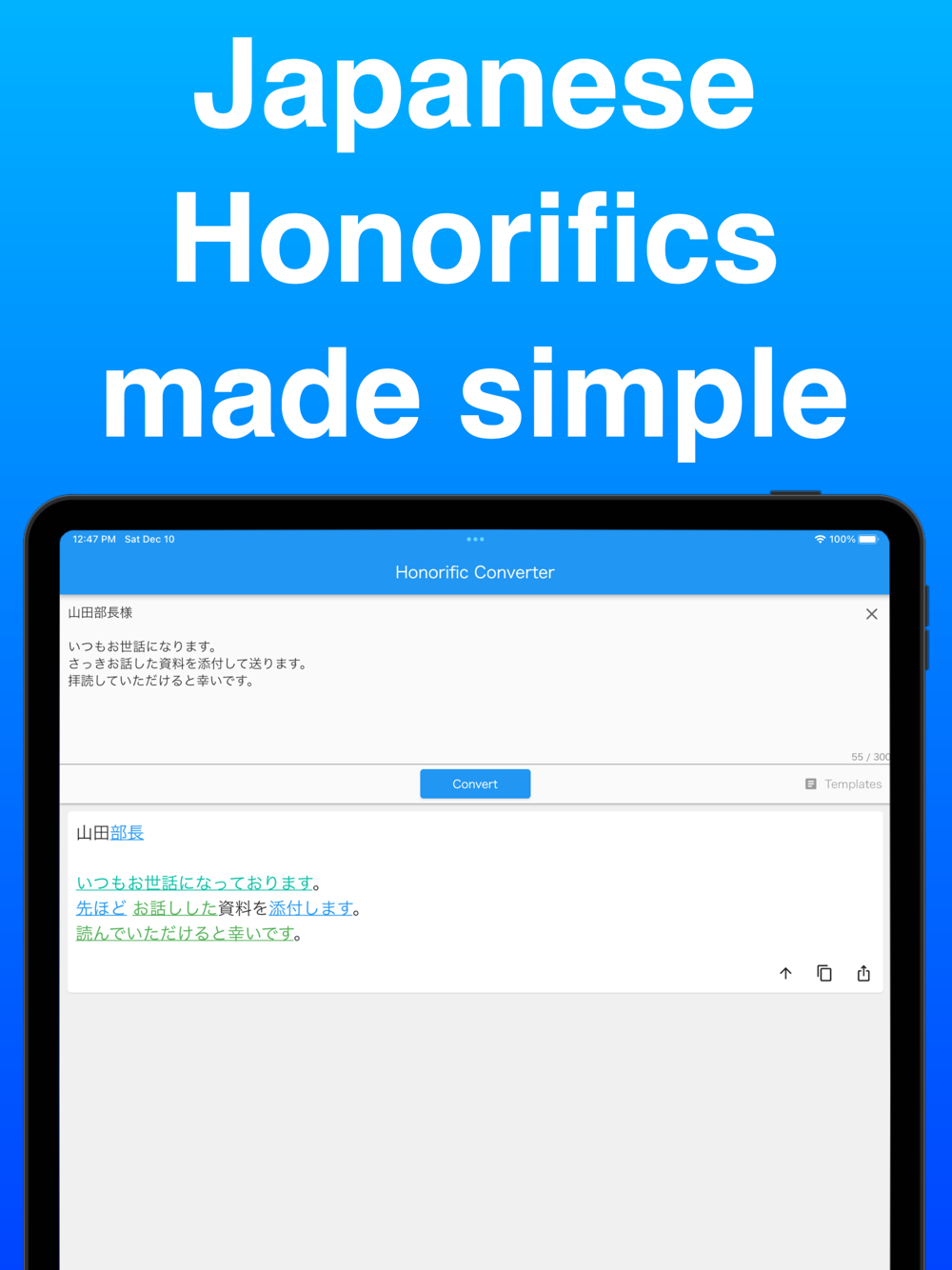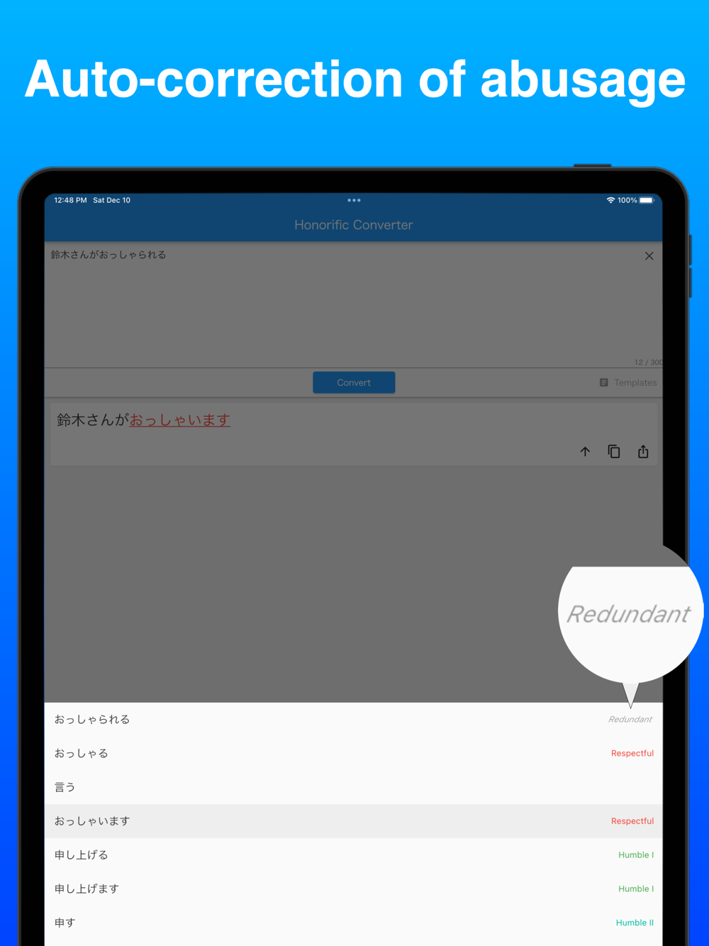 After conversion or generation, tap the word and change the honorific type according to the sentence.