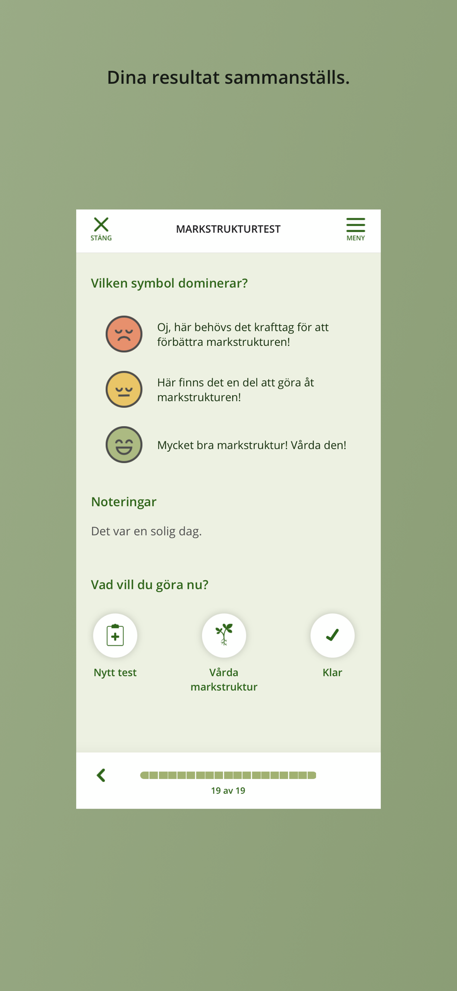 Appen hjälper dig få koll på markstrukturen på din jordbruksmark. Du får pedagogisk vägledning i att utföra appens tre deltest, kan göra åtgärdslistor för att vårda och förbättra strukturen och följa upp förändringar. En god och stabil markstruktur är grunden för en väl fungerande odlingsjord. Du kan välja svenska eller engelska som språk i appen.