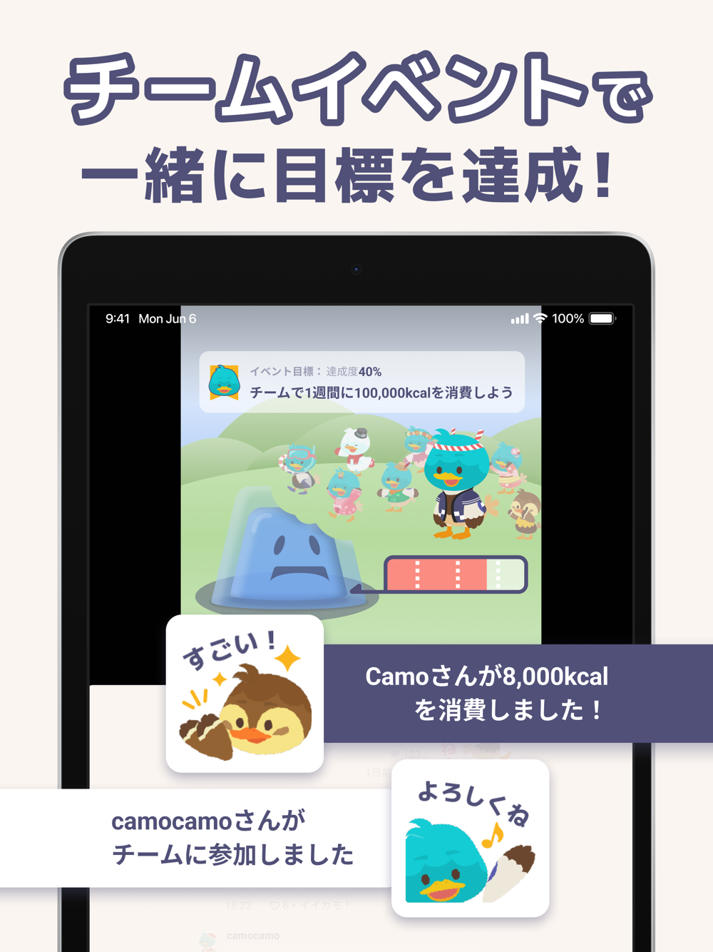 【カラダモ】は、月に1回のイベントを通じ、チームの仲間と同じ目標に向けて記録を続けることで、ダイエットの継続をサポートするアプリです。