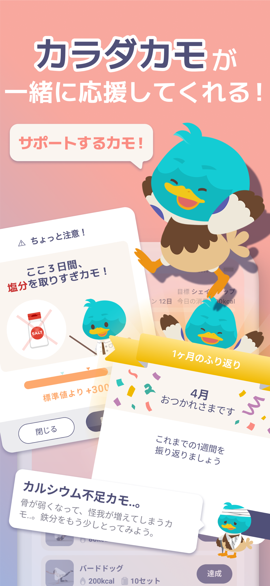 アプリ内に住むカモ「カラダカモ」が、あなたのダイエット記録をサポート!