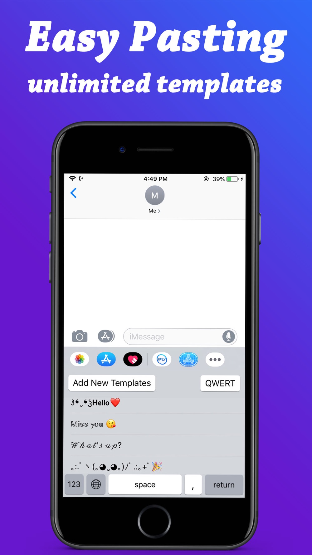 You're able to create your templates or phrase like email reply, addresses used many times, game promo code, etc. Then use Auto Paste keyboard to paste them in any app just by tapping.