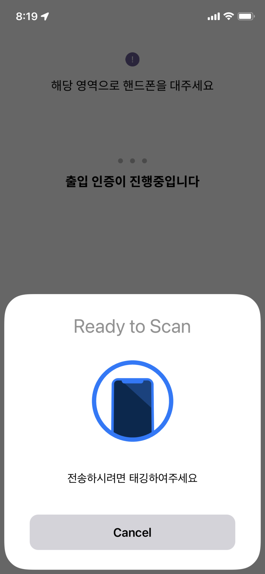 3. NFC가 자동으로 활성화되며 핸드폰을 출입 Tag에 가볍게 터치하면 됩니다.