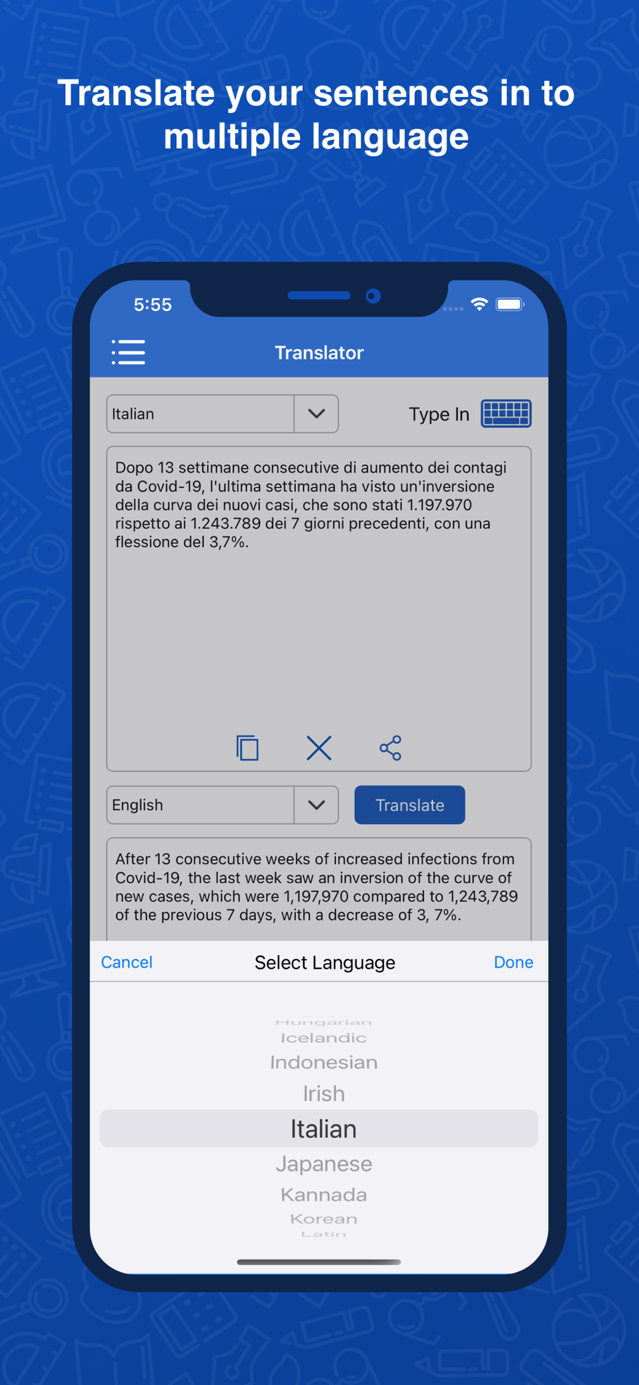 6- There is a feature in our app that you will not find in any other app is- Users can write the sentences in the selected language and translate them into the other selected language also they can copy and share the translated text with anyone.