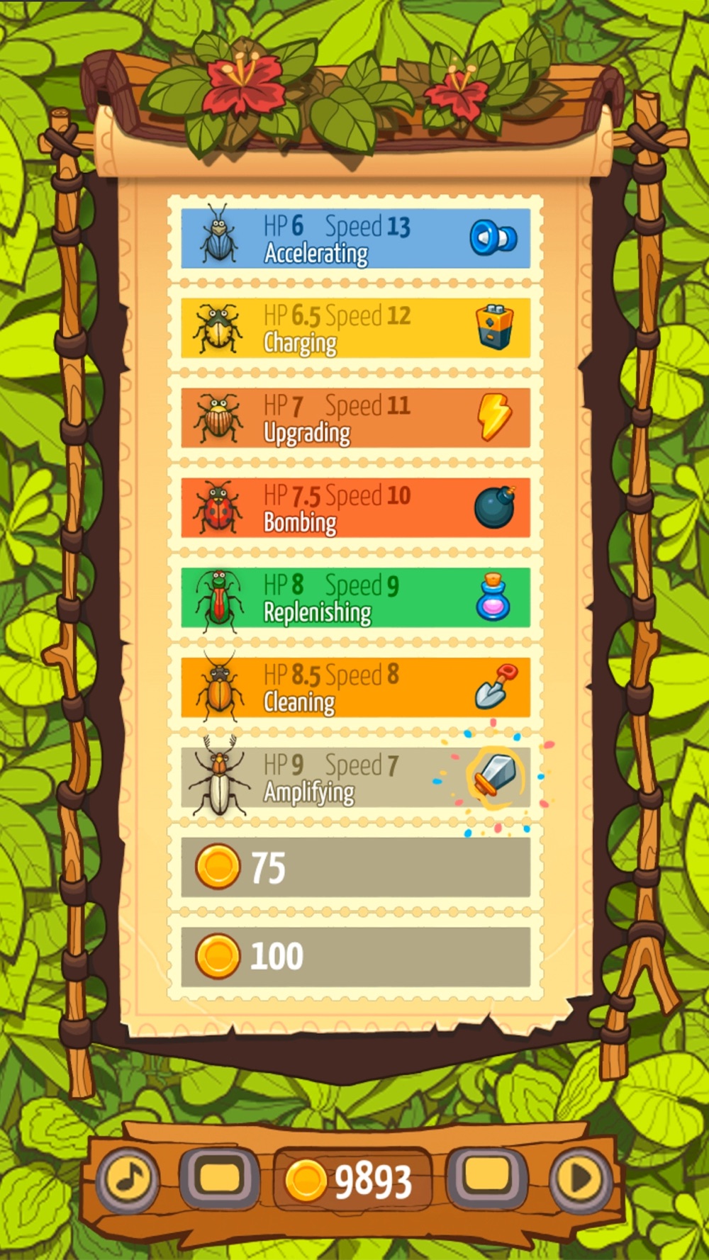 Keep eating and collecting gold coins in the start location to open new bugs and clearings! Every location has various kind of plants with different skills. And don't forget to use your bugs as efficiently as possible to hold out more time on the location!