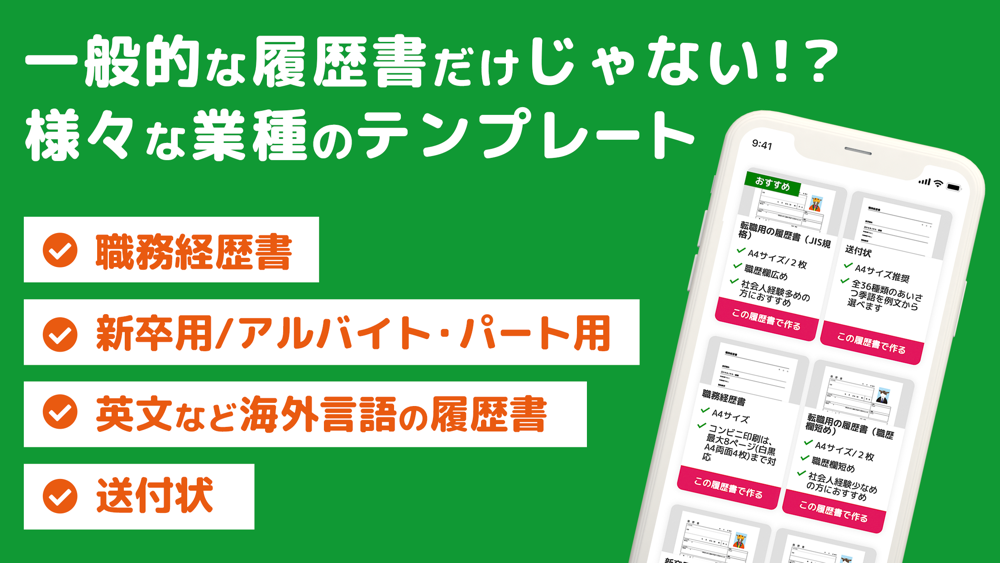 ・転職用、新卒用、アルバイト用、パート用、インターン用など様々なシチュエーションにあった履歴書テンプレートが選択できます!