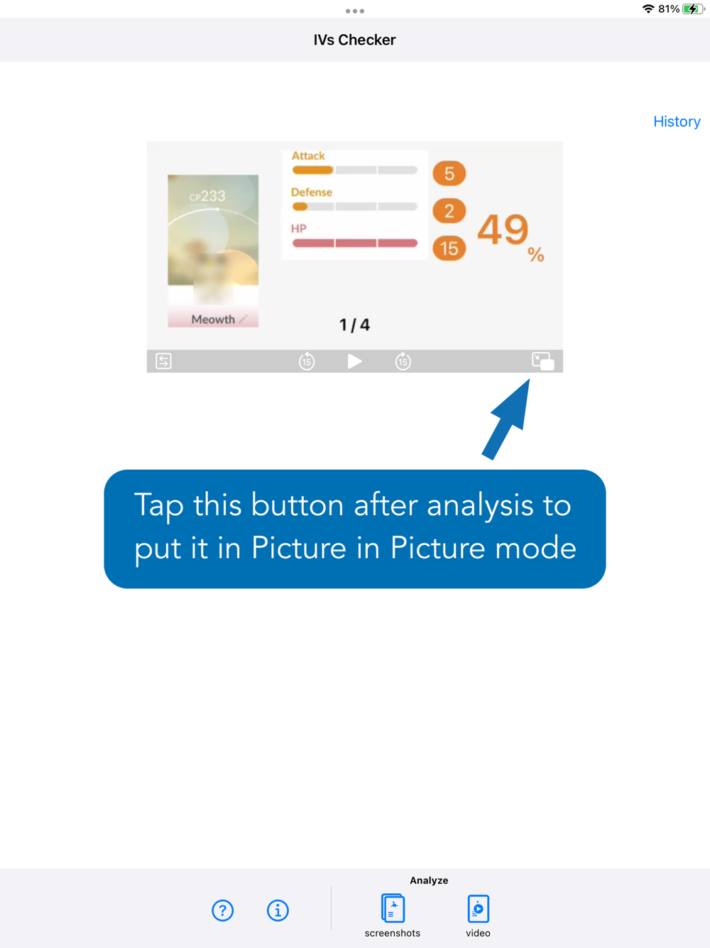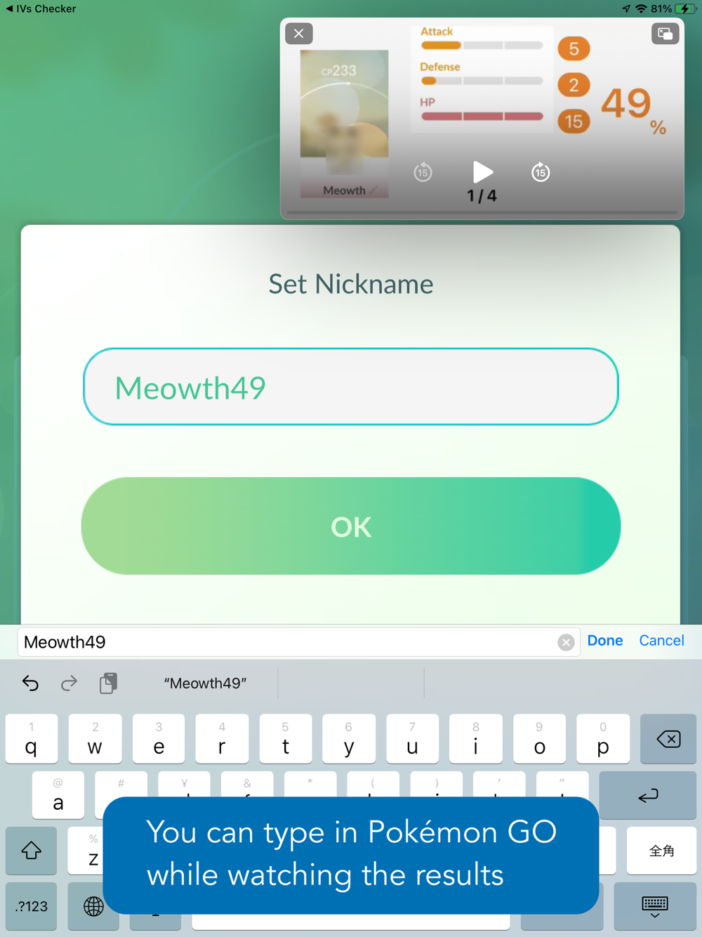 You can view the results in Picture in Picture so that you can easily record the IVs in the Pokémon GO app.
