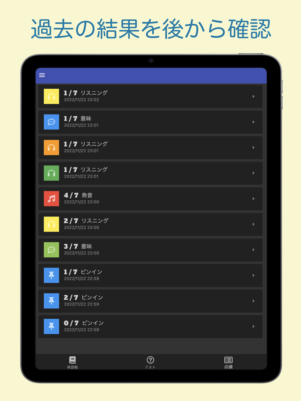実施した単語テストについては履歴から確認し、間違った問題を復習できます。